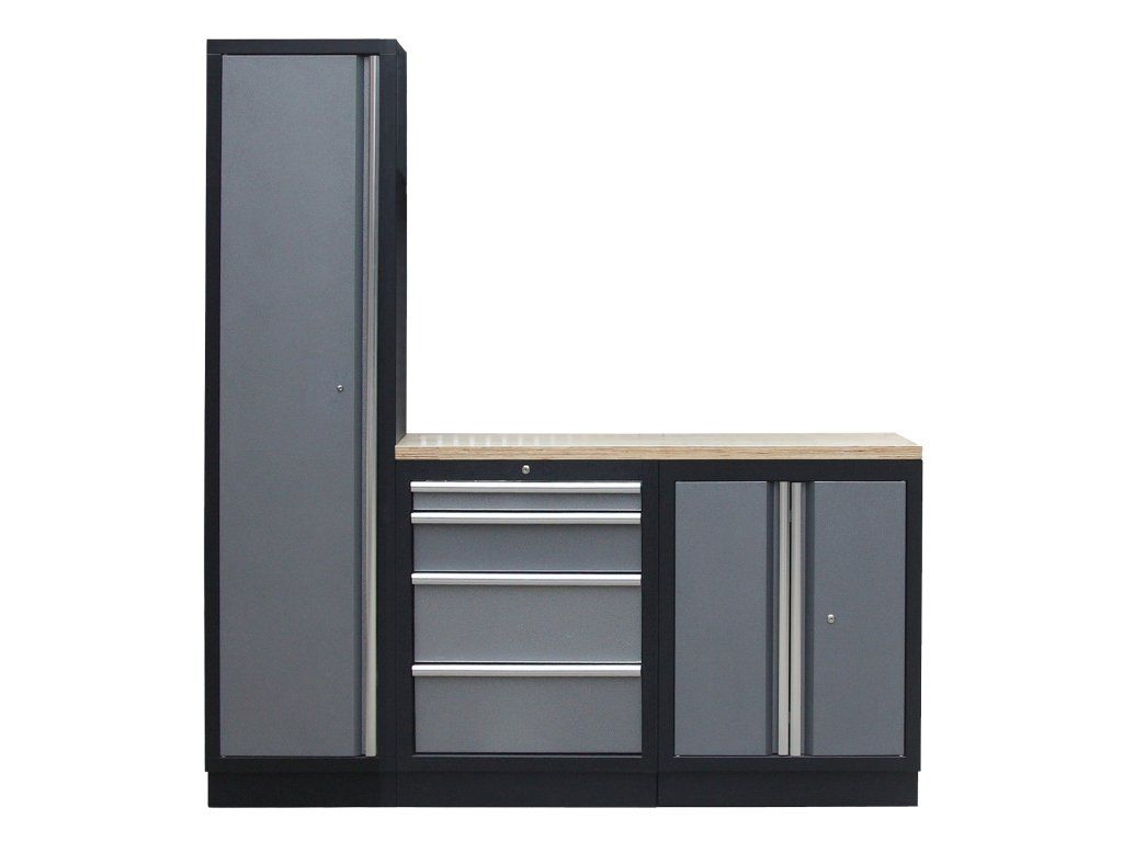Sestava nábytku v sobě skrývá dostatečné množství úložného prostoru pro vaše nářadí, autotechniku i dílenské vybavení. V kombinaci s bytelnou pracovní deskou získáte multifunkční stěnu, se kterou vám půjde práce od ruky ve všech směrech.
