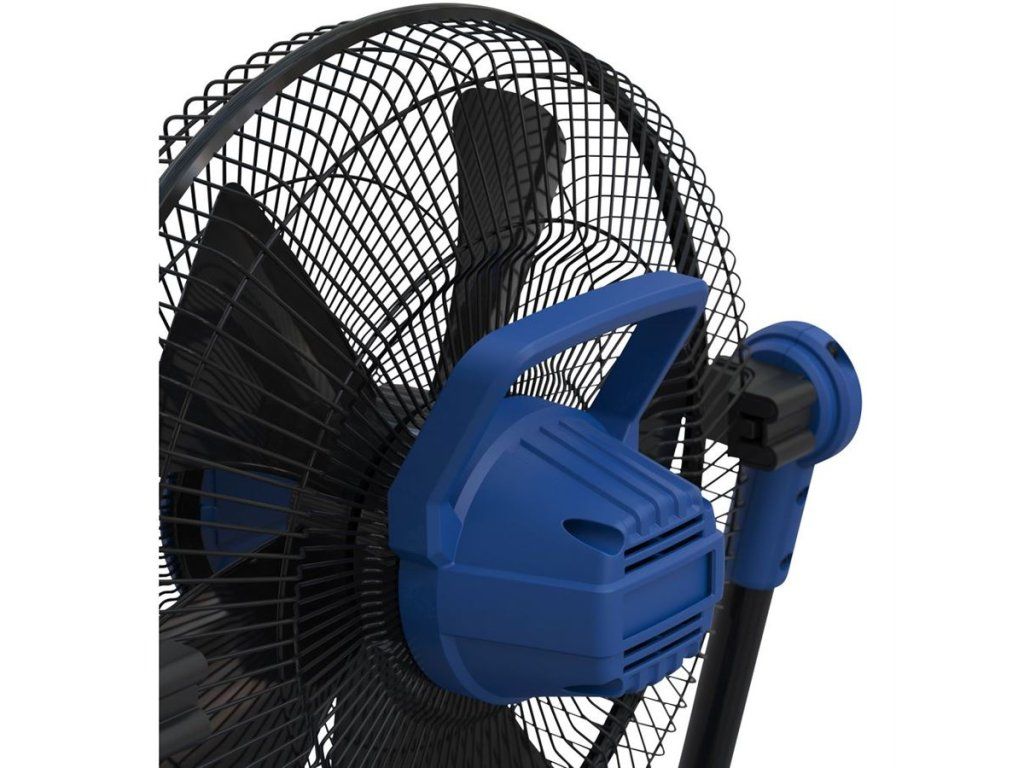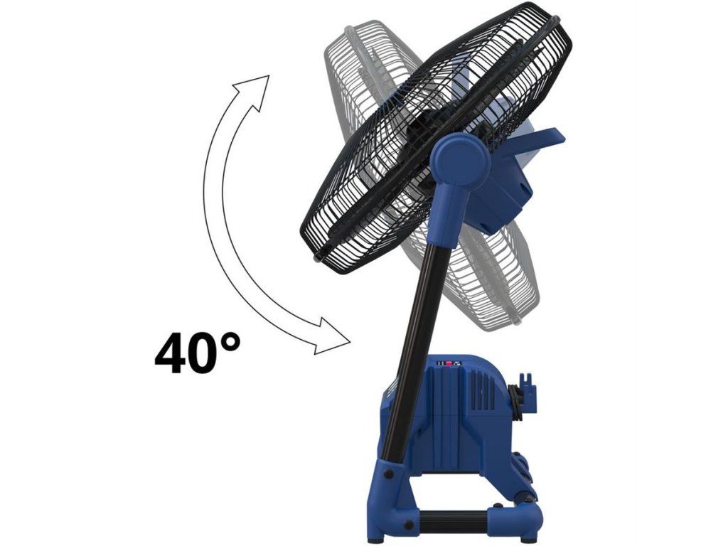 Konstrukce: polohovatelná vrtule ventilátoru (s vertikálním nakláněním ± 40°), ochranná kovová mřížka, stabilní trubkový stojan, držadlo pro pohodlné přenášení.