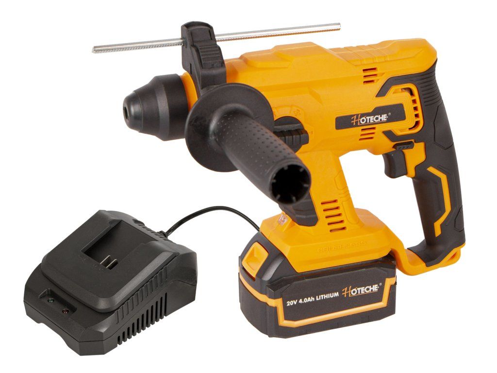 Vrtací kladivo je dodáváno včetně akumulátoru 4 Ah a nabíječky. Stejné baterie Hoteche pasují i do dalšího AKU nářadí od značky Hoteche.