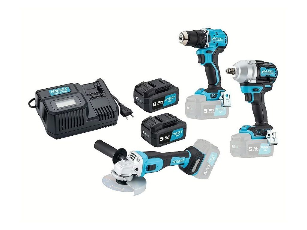 Sada aku nářadí Hazet – vrtačka, rázový utahovák, úhlová bruska, 2x aku, nabíječka