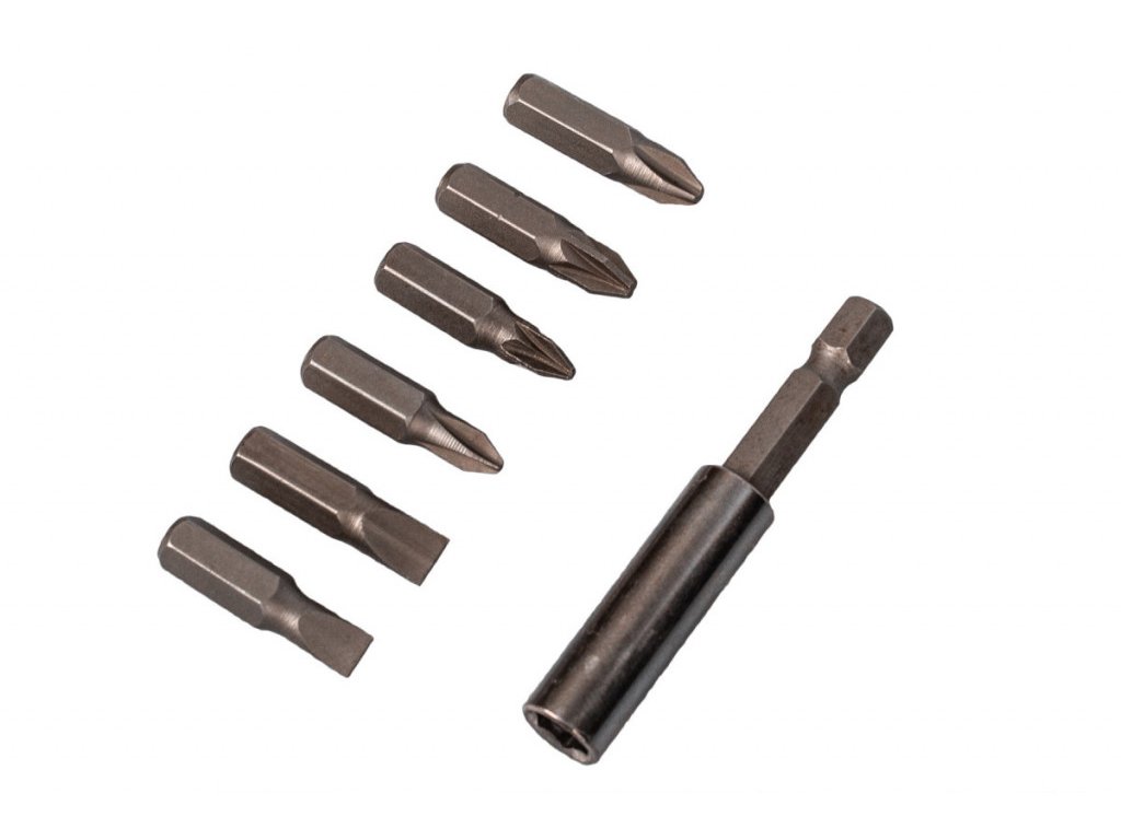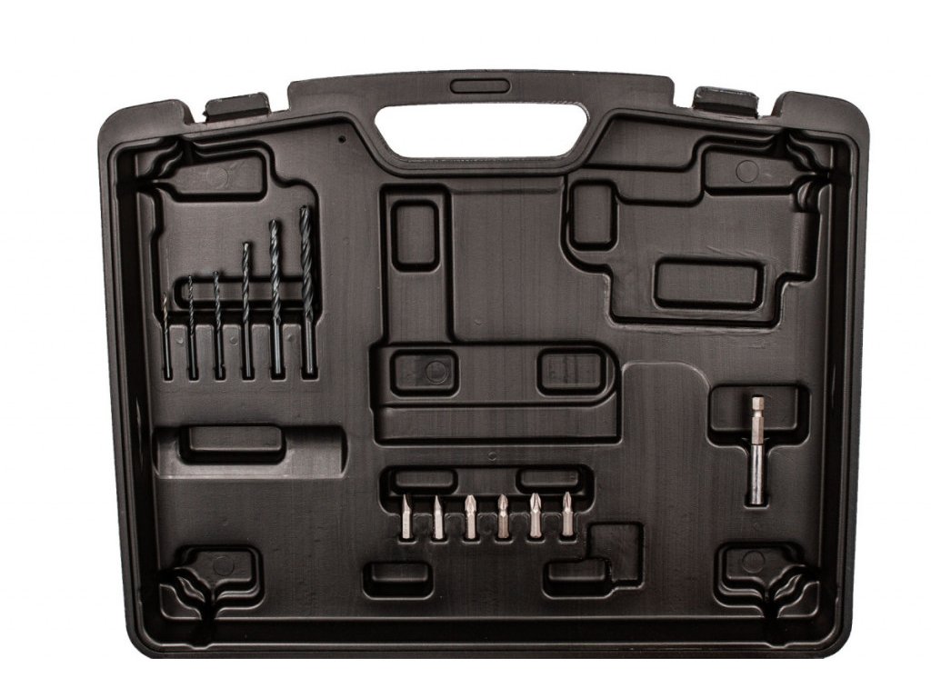 - Praktický plastový kufr se sadou vrtáků a bitů.