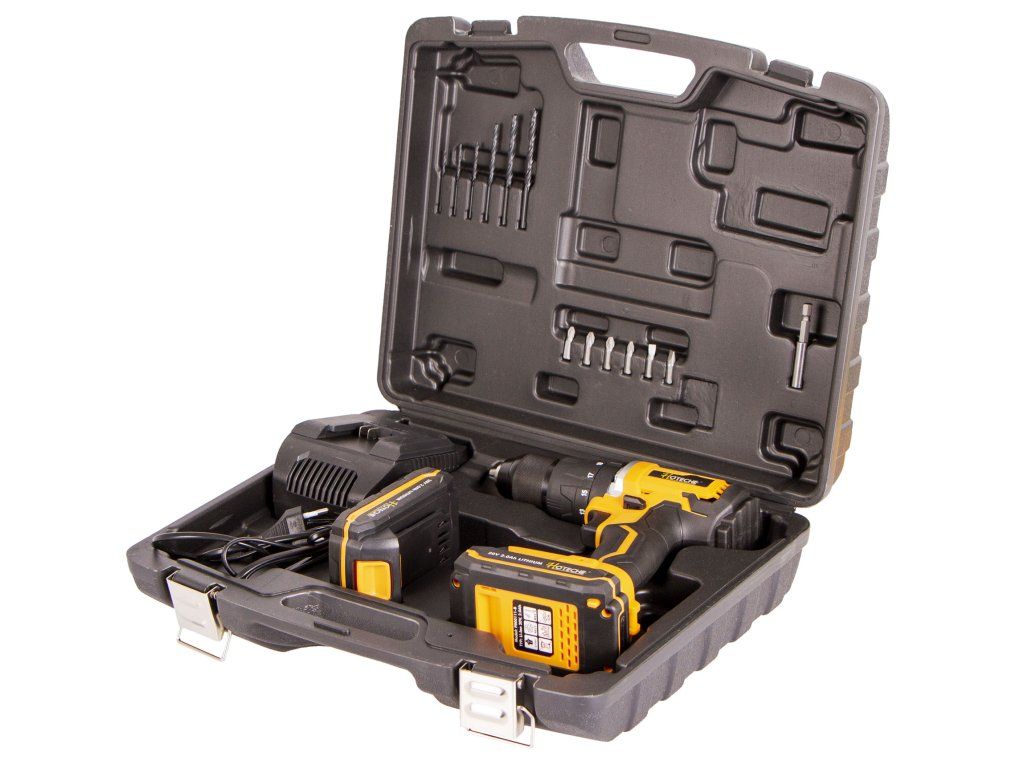 Součástí balení jsou 2 Li-ion akumulátory 20 V / 2 Ah s indikátorem nabití, nabíječka a sada vrtáků a bitů v praktickém kufru.