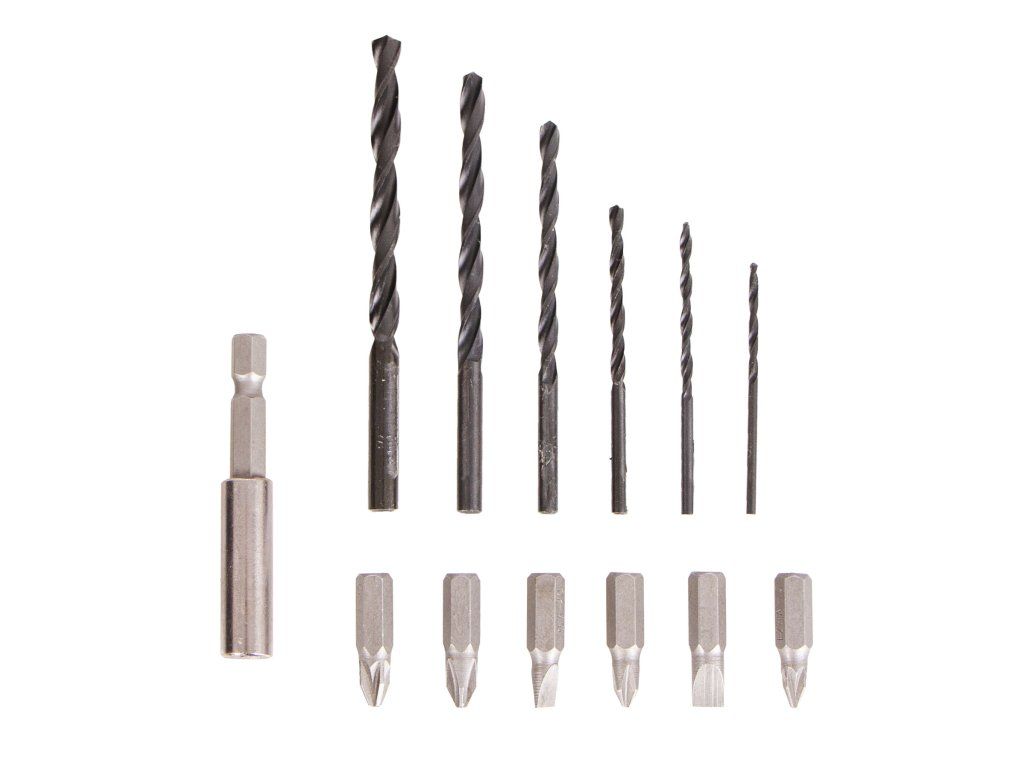 - Součástí praktický kufr s příslušenstvím – vrtáky, bity, nabíječka, magnetický držák.