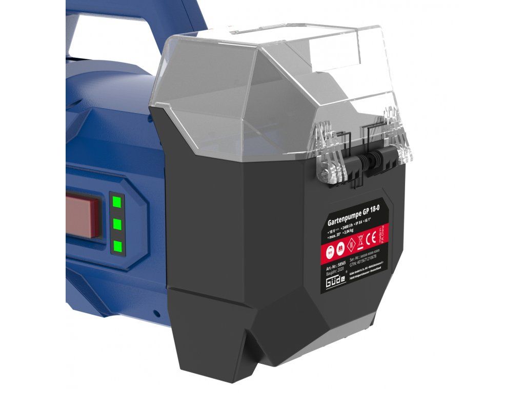 Aku zahradní čerpadlo, max. průtok 2 400 l/hod, max. sací hloubka 6 m, max. výtlačná výška 20 m. Li-Ion akumulátor 18 V, nabíječka 3,0 A/h. Rozměr 455 x 230 x 295 mm, hmotnost 3,8 kg.