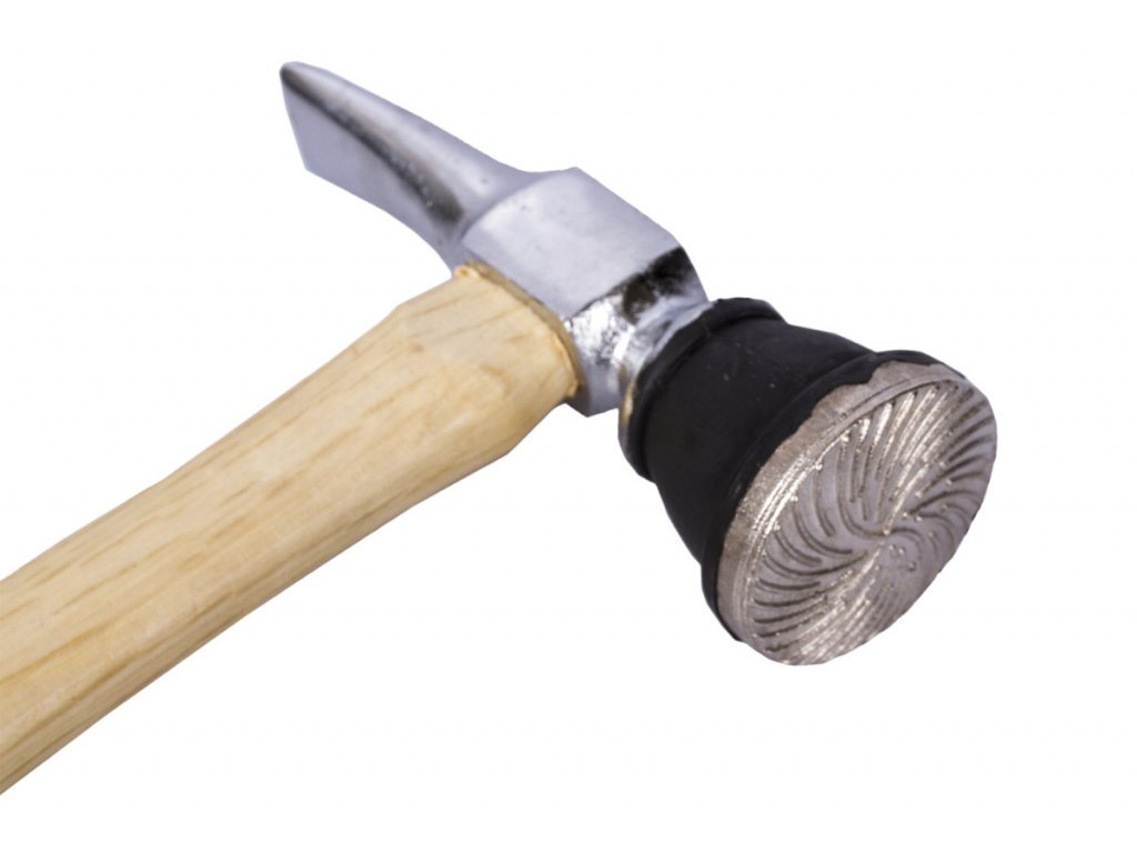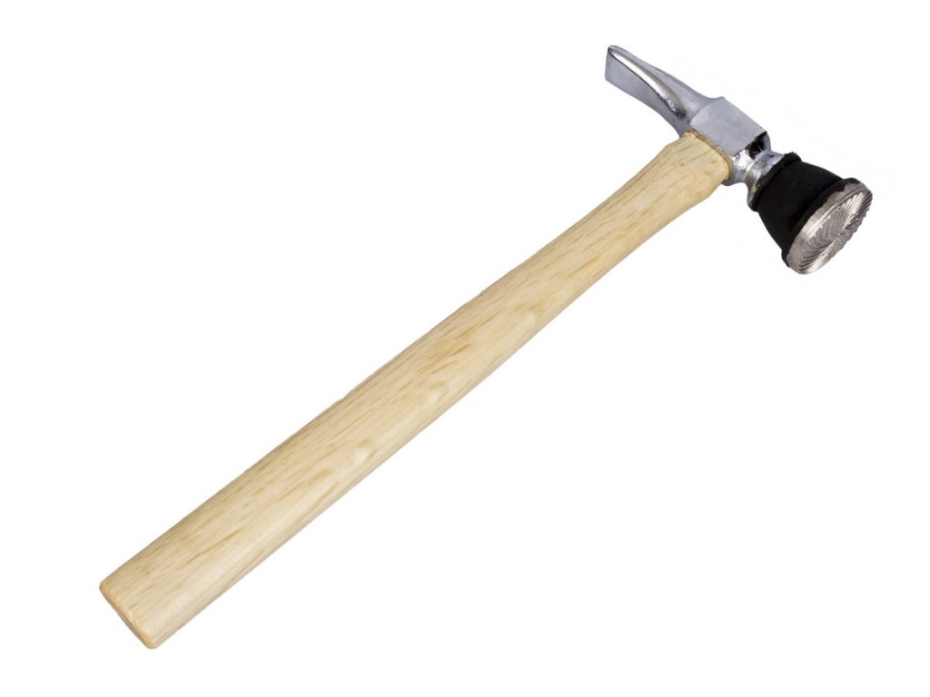 Autokarosářské kladivo s dřevěnou násadou o délce 295 mm se speciálně tvarovanou spirálovou hlavou, která napomáhá smršťovat kov při nárazu a druhým, špičatým koncem hlavy.