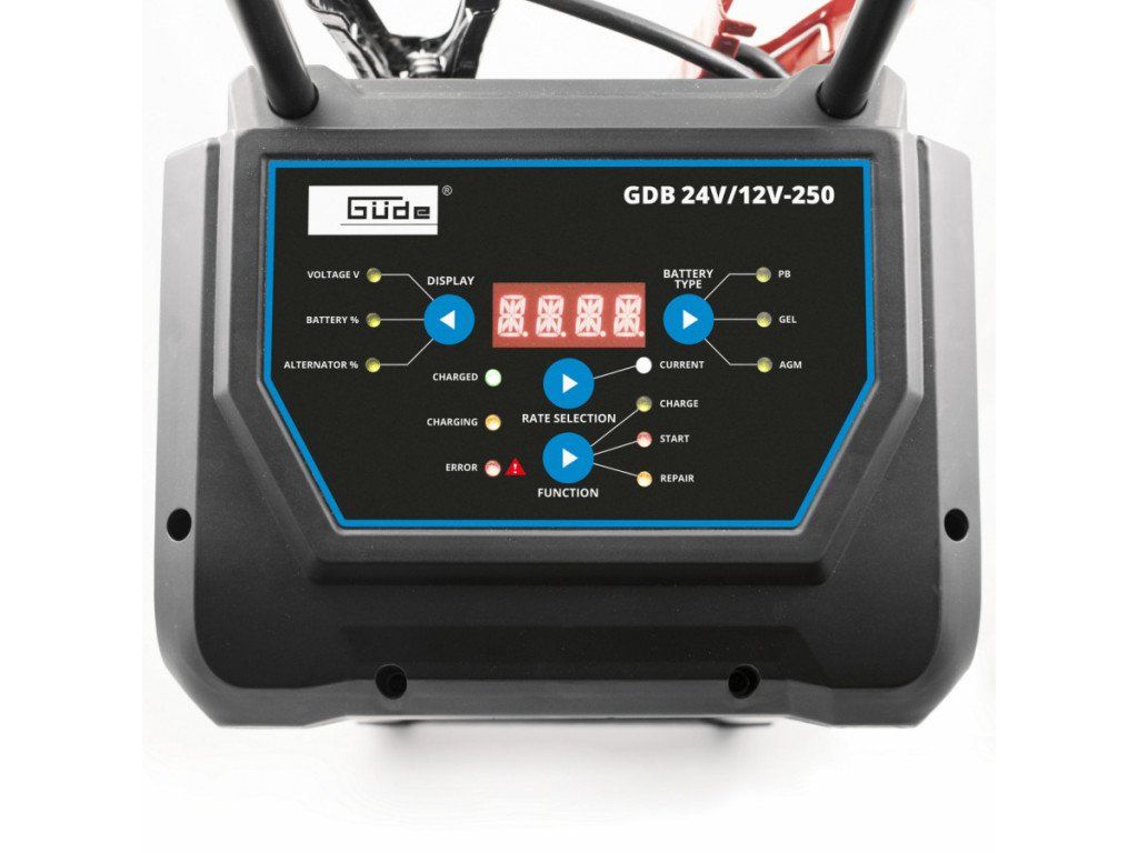 Automatické nabíjení (10stupňový nabíjecí cyklus) nebo udržovací (pulzní) dobíjení 12 - 24 V olověných akumulátorů s elektrolytickým roztokem (WET), gelovým elektrolytem (GEL), AGM (sklolaminátovými mikrovlákny) i uzavřených bezúdržbových baterií (MF).