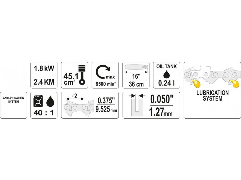 Motorová pila s řeznou délkou 360 mm, výkonem 1800 W, 8500 ot./min. Nádrž 240 ml.