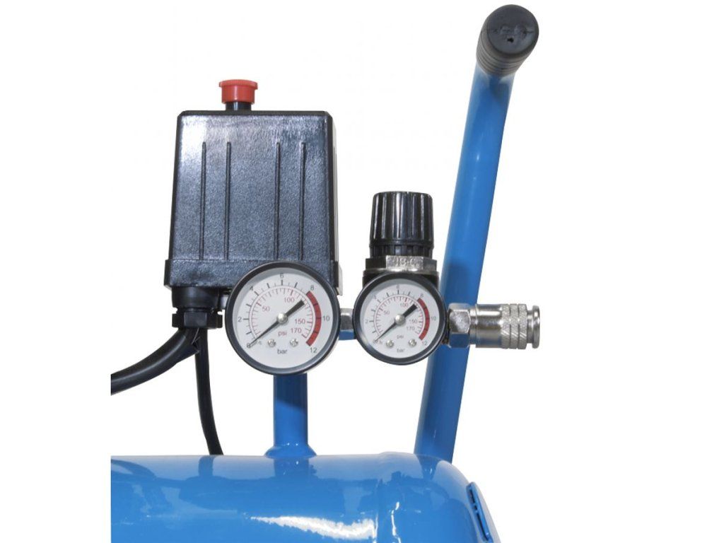 Vybavení: 2 manometry, 1 výstup stlačeného vzduchu (kovová rychlospojka), tlakový spínač, redukční ventil, pojistný přetlakový ventil, zpětný ventil, vzduchový filtr, 1,5 m síťový kabel H05 VV-F.