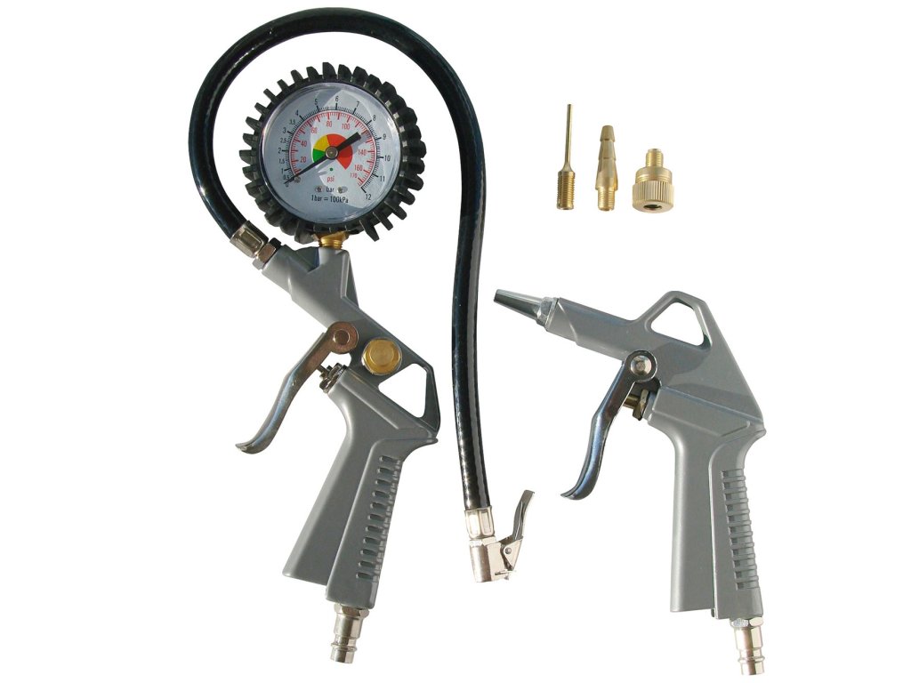 Sada obsahuje vyfukovací pistoli, hustilku pneu a komplet 3 adaptérů pro nafukování míčů, matrací a pneumatik. Kompresor je vybaven 2,5 m tlakovou hadicí s rychlospojkou, adaptéry, boxem na příslušenství a transportním madlem.