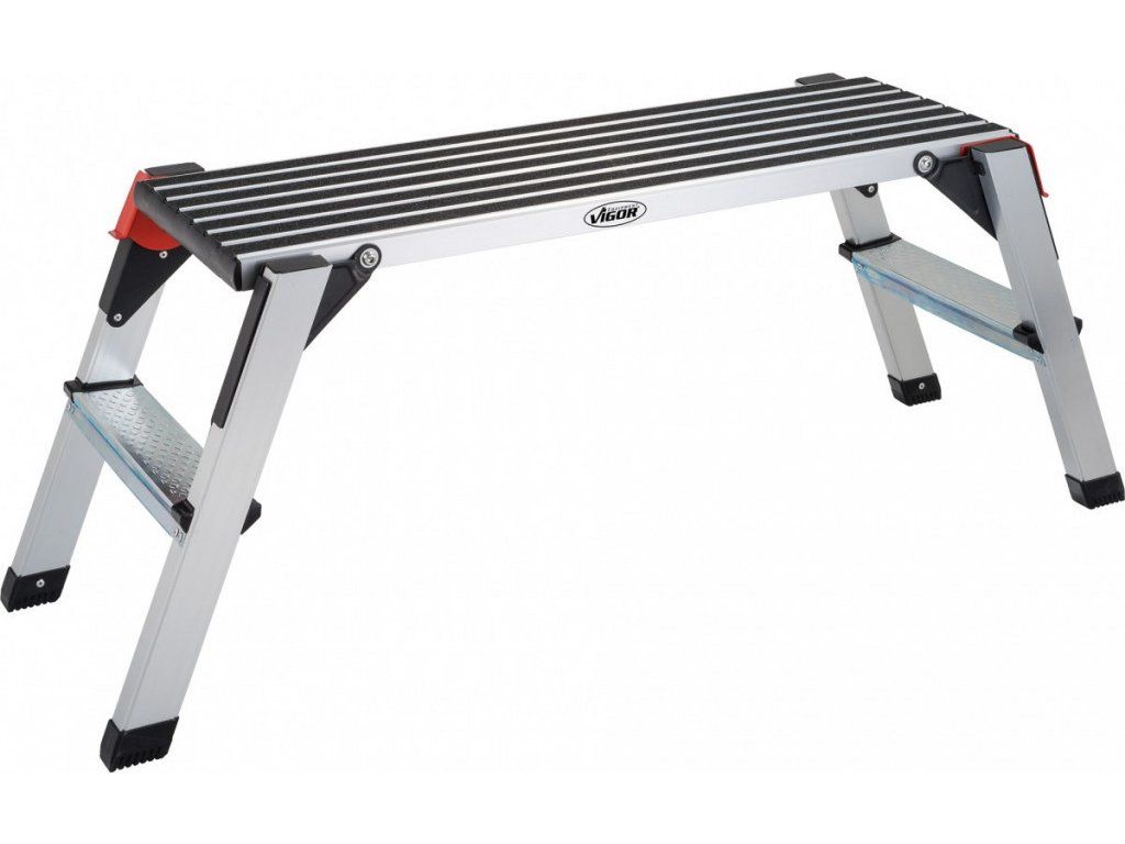 Hliníková bezpečnostní plošina, bezpečnostní aretace na obou patkách, nosnost až 150 kg, rychlé složení, snadno přenosná. Rozměry 950 x 300 x 490 mm.