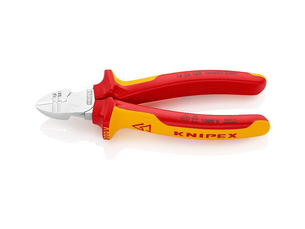 S prodlouženým břitem. Zlepšený převod se zvýšením řezného výkonu o 25 %. Precizní otvory pro odizolování pro jednožilové vodiče (masivní) 1,5 a 2,5 mm?. Pohodlné řezání kabelů NYM do průměru 5 x 2,5 mm?. Dlouhé hroty pro nejjemnější řezání i v omezených podmínkách. Induktivně kalené precizní břity pro měkký drát do ? 4 mm, tvrdost břitu asi 60 HRC. Vanadová elektroocel- kovaná, kalená v oleji.