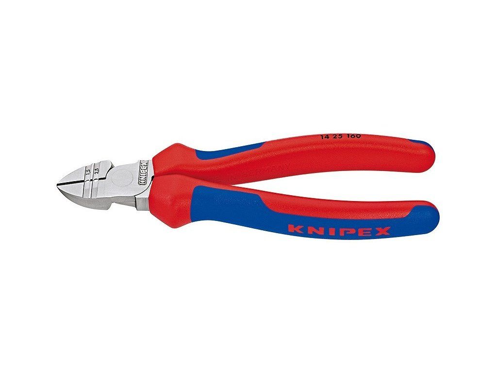 Boční odizolovací kleště od kvalitního výrobce Knipex, prodloužený břit, ergonomické rukojeti, otvory pro odizolování vodičů 1,5 a 2,5 mm².