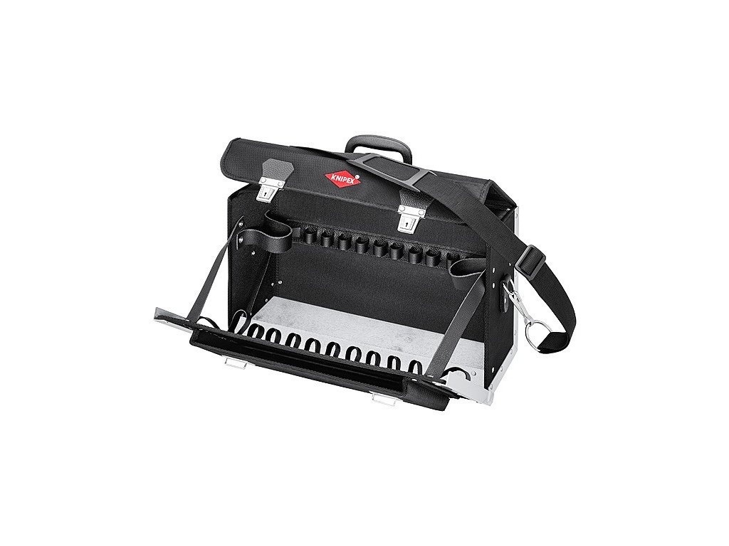 Lehké provedení z odolné, zesílené polyesterové tkaniny. Přední stěna navíc zesílena hliníkovými úhelníky. Přední stěna částečně sklopná s nastavitelnými pásky a přihrádkou na dokumenty na vnější straně. S pozinkovanou vaničkou na dně. S držadlem pro nošení a nastavitelným popruhem. Taška na nářadí s bočním stěnami a vaničkou na dně z černého plastu HDPE s dvojitou stěnou a odolného vůči vlhkosti. Přední stěna, zadní stěna a víko z hovězí kůže, černá. Přední stěna navíc zesílena hliníkovými úhelníky. Přední stěna částečně sklopná s nastavitelnými pásky a přihrádkou na dokumenty na vnější straně. Zadní stěna s plastovým výliskem sloužícím jako držák pro 11 pásků. Držadlo pro přenášení. Rozměry, vnitřní (š x v x h): 420 x 250 x 160 mm. Bez nářadí.