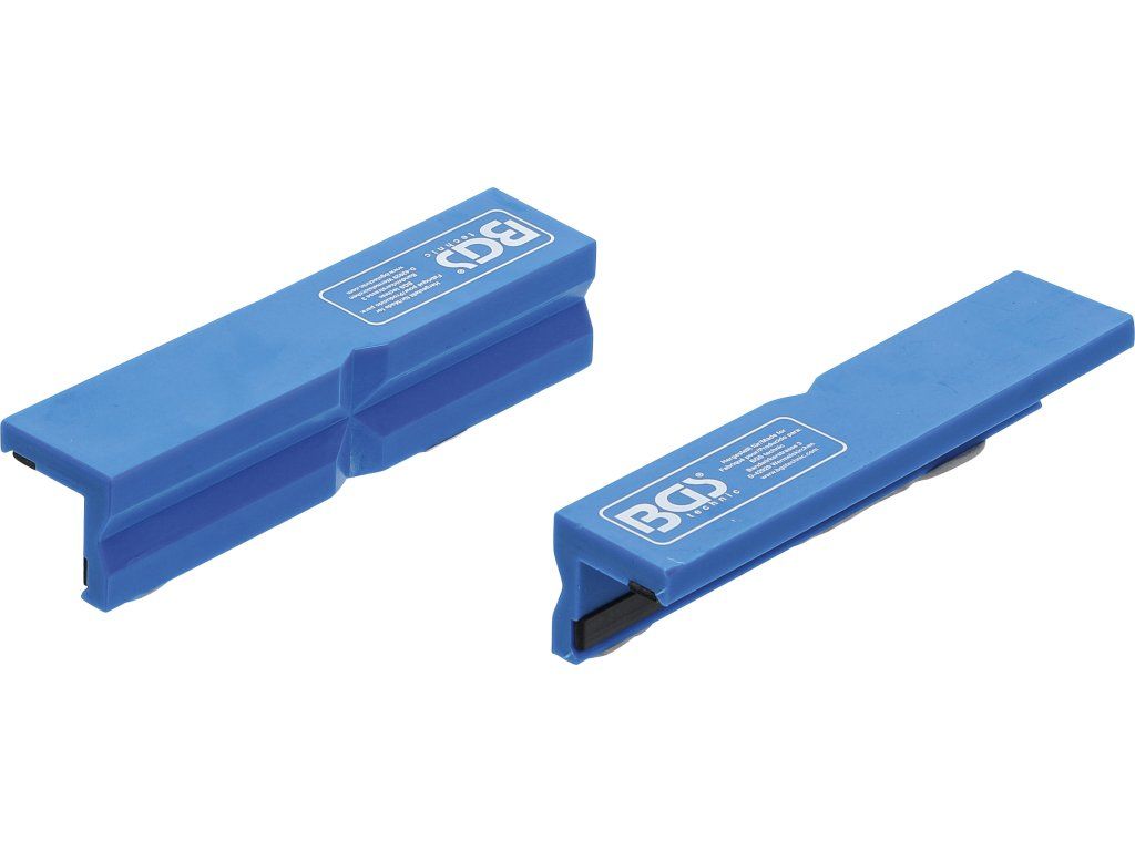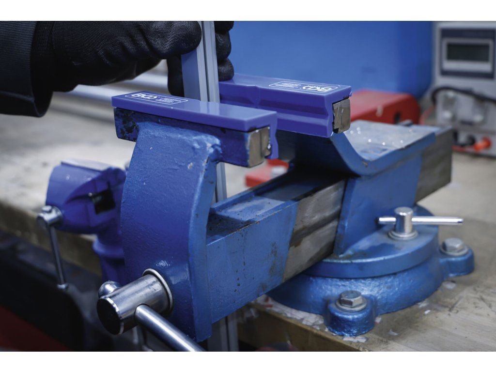 Plastové čelisti svěráku se zářezy jsou určené především pro pohodlnější upínání kulatých předmětů.