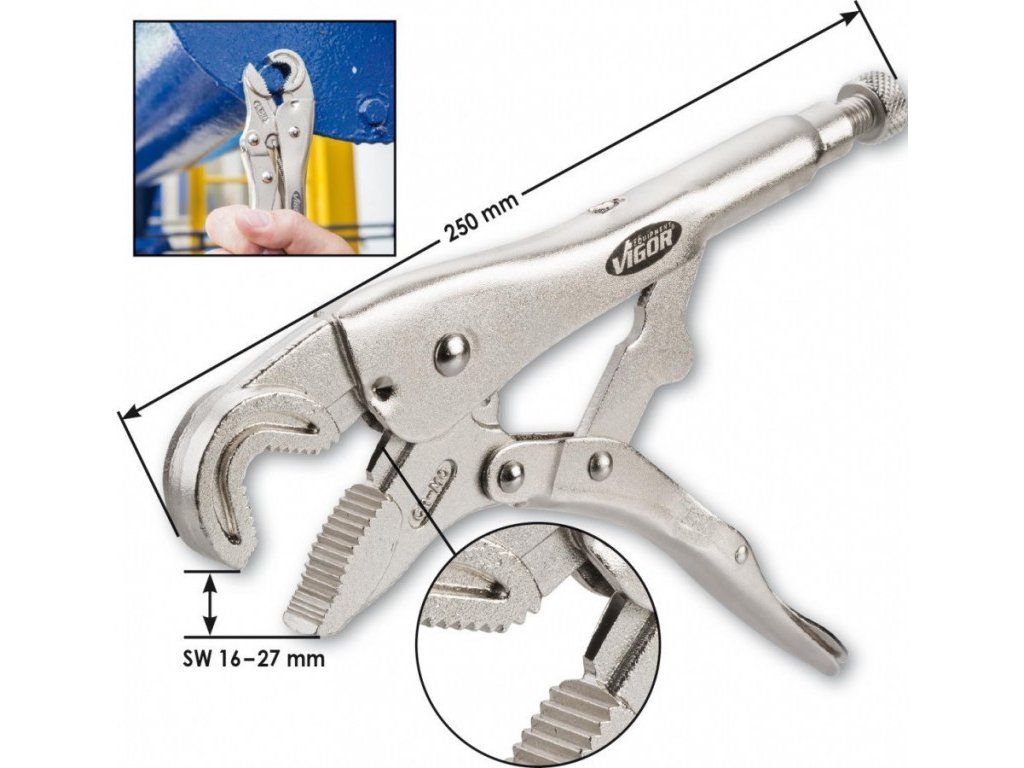 Kvalitní čelisťové svírací kleště od německé značky VIGOR, délka 250 mm, rozpětí 16-27 mm.