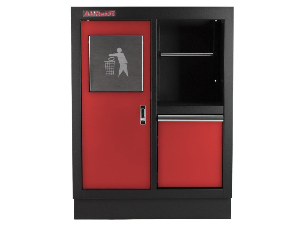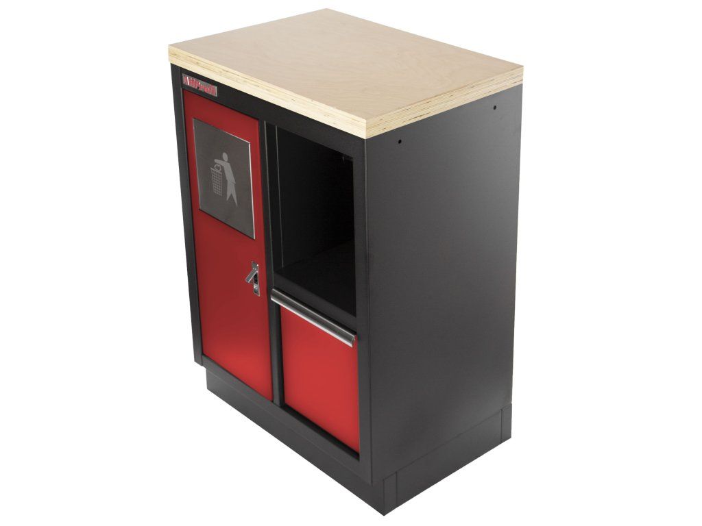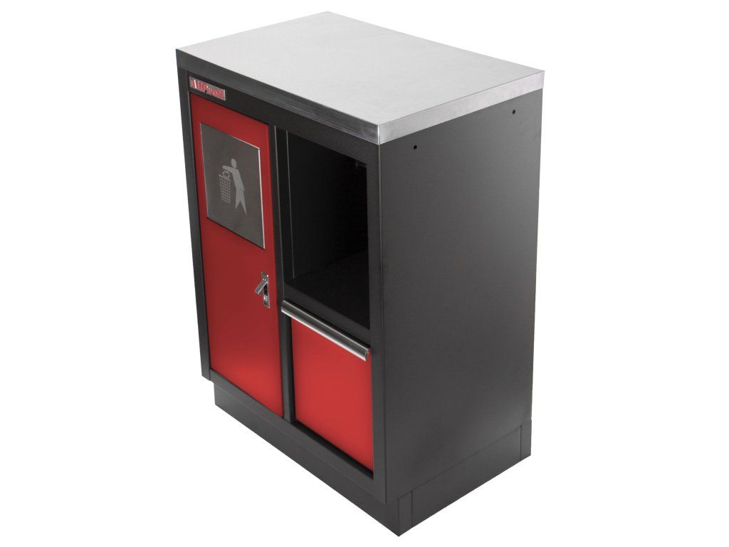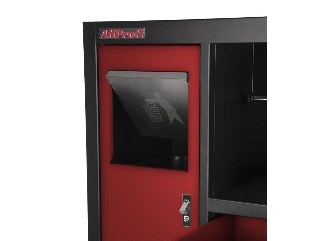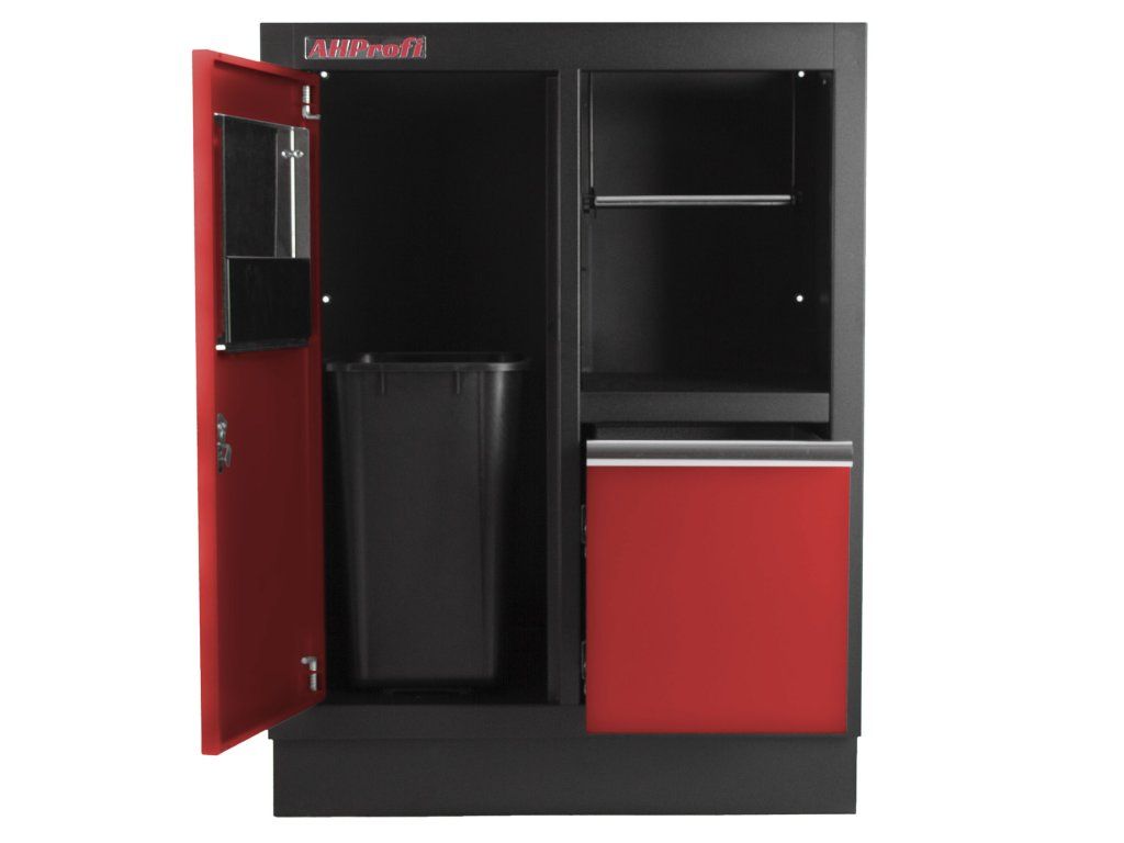 Celokovová dílenská skříňka. Skříňka obsahuje odpadkový koš a držák na role papíru, je vhodná do profesionálních servisů, dílen, ale také do garáží.