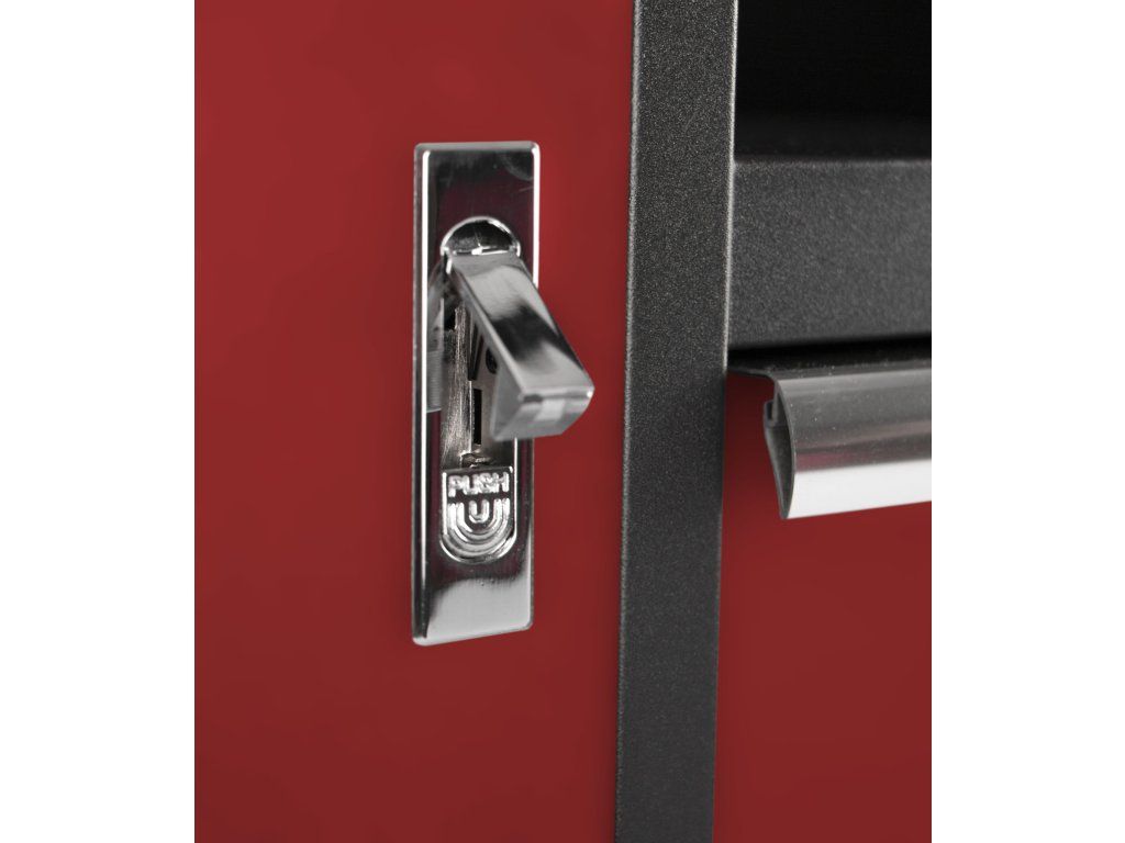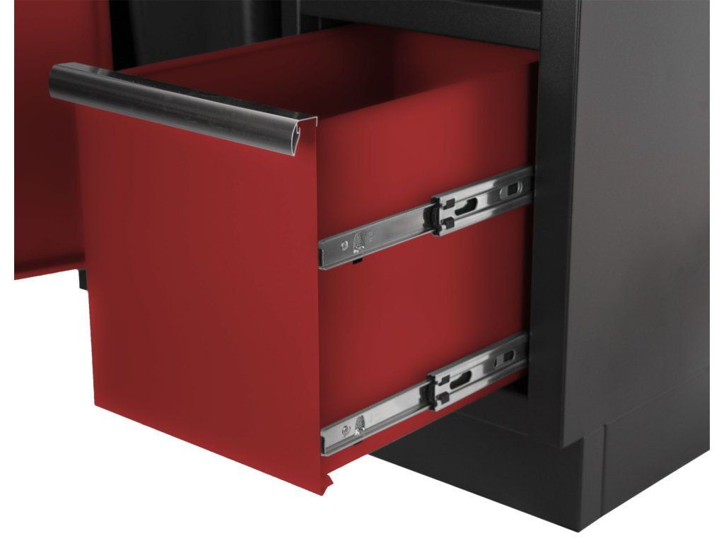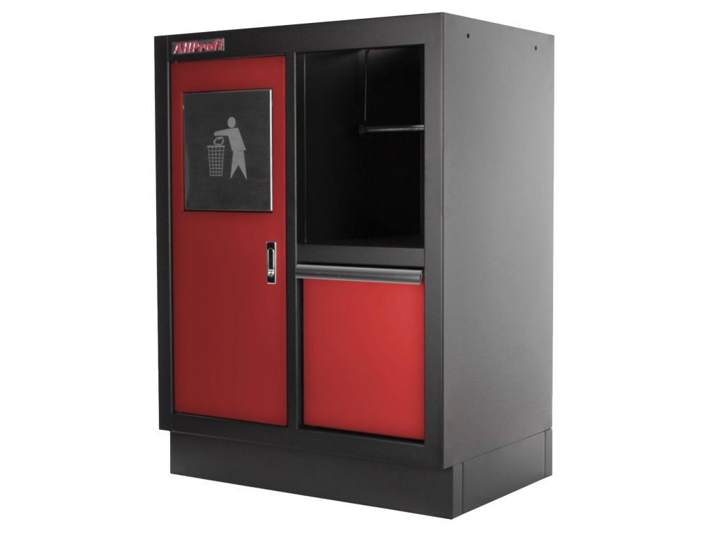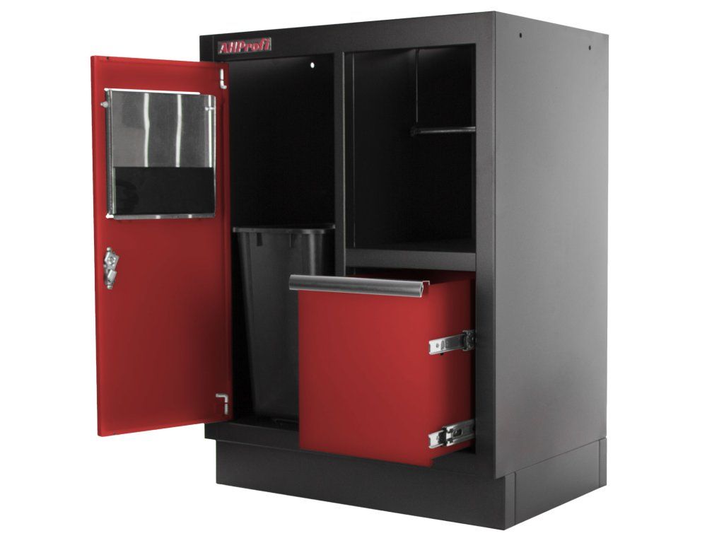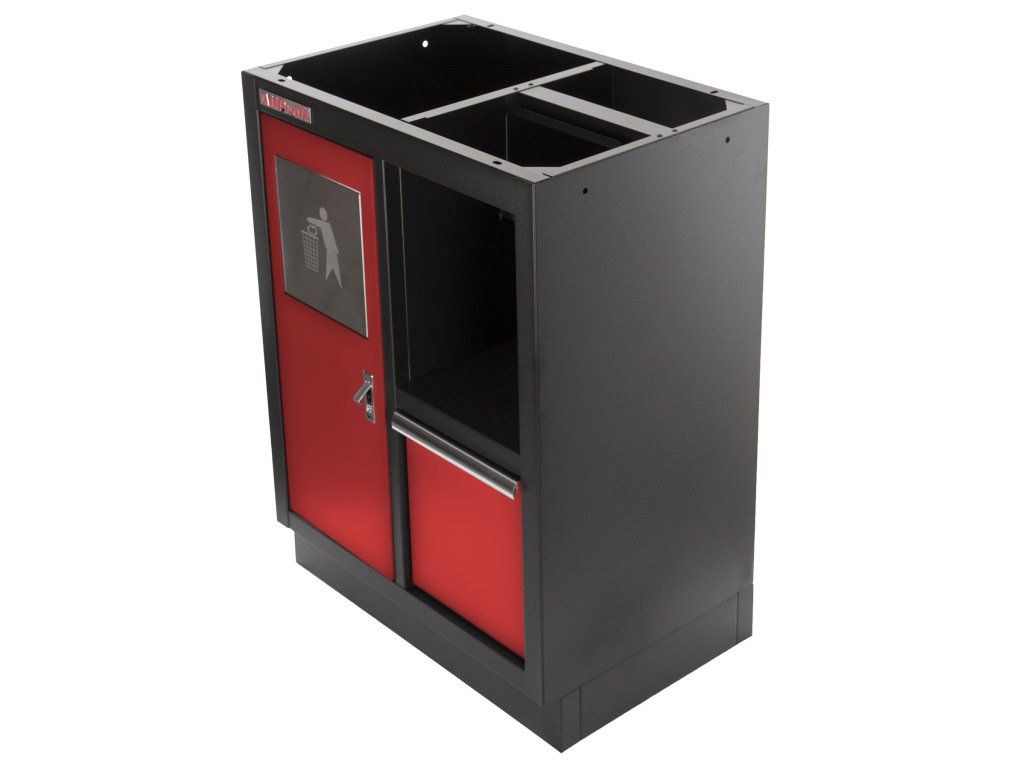 Celokovová dílenská skříňka. Skříňka obsahuje odpadkový koš a držák na role papíru, je vhodná do profesionálních servisů, dílen, ale také do garáží.
