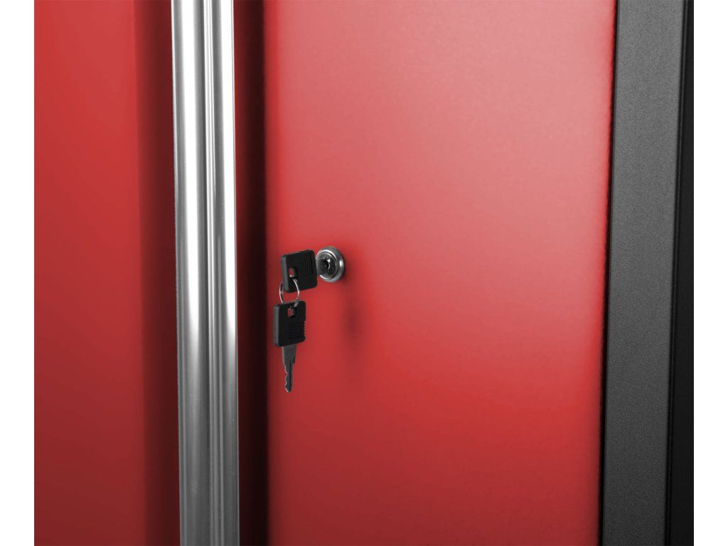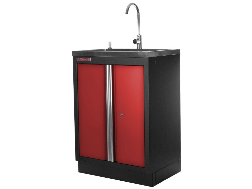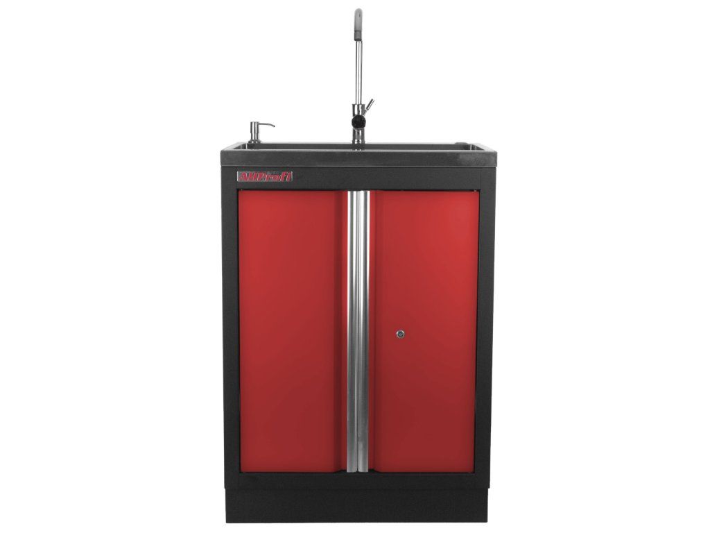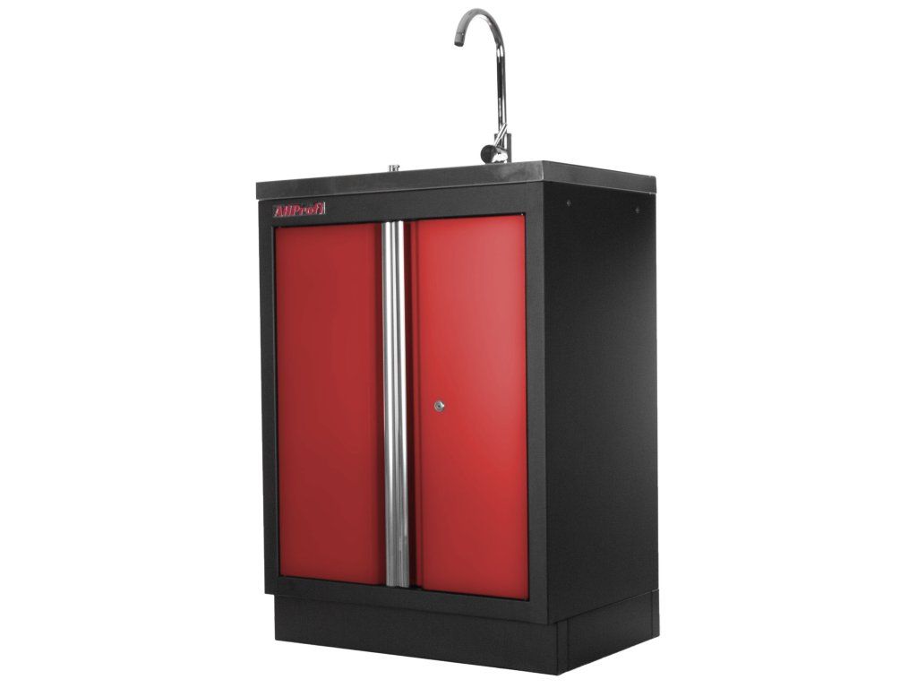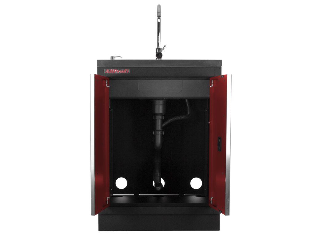 Celokovová PROFI RED dílenská dvoukřídlá skříňka s vestavěným nerezovým dřezem a baterií.