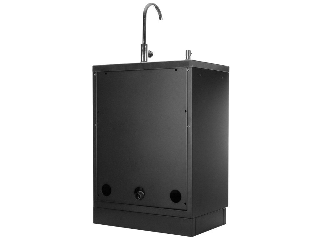 Kompletně vybavená skříňka s baterií, kterou lze umístit do jednoho z rohů nebo doprostřed nerezového dřezu.
