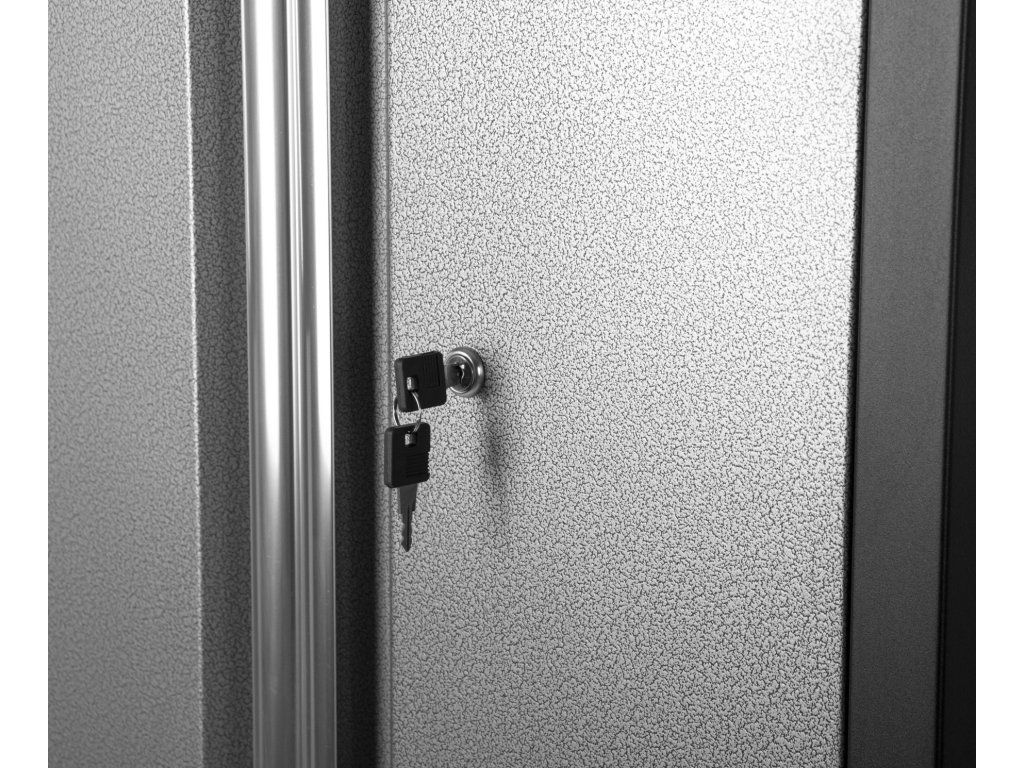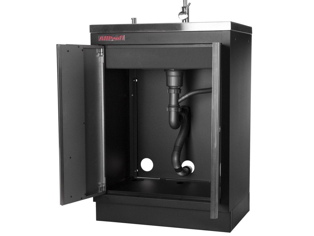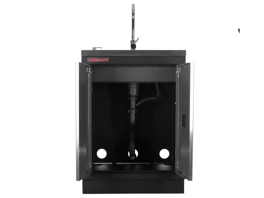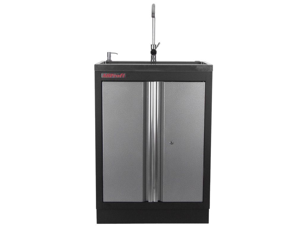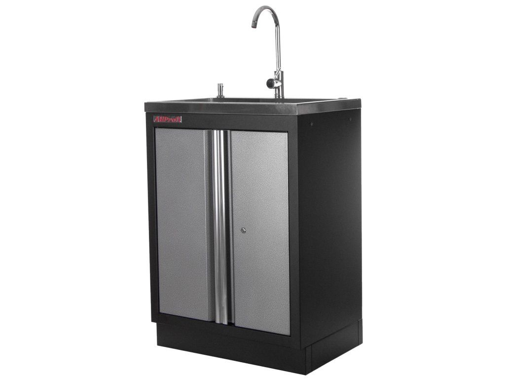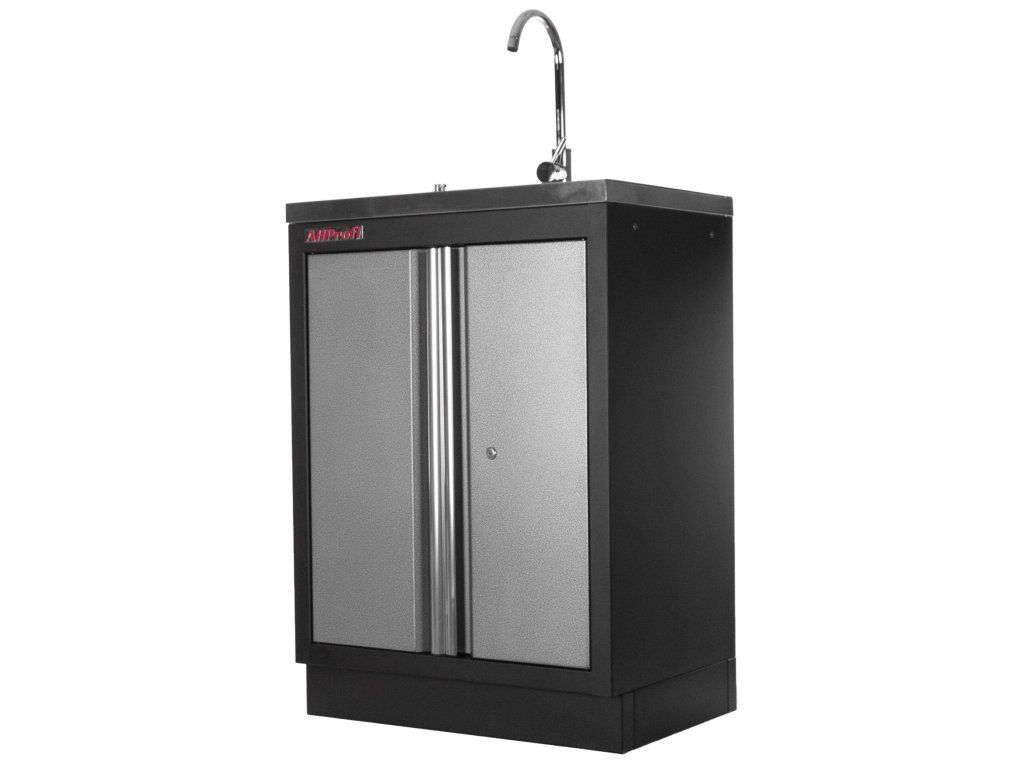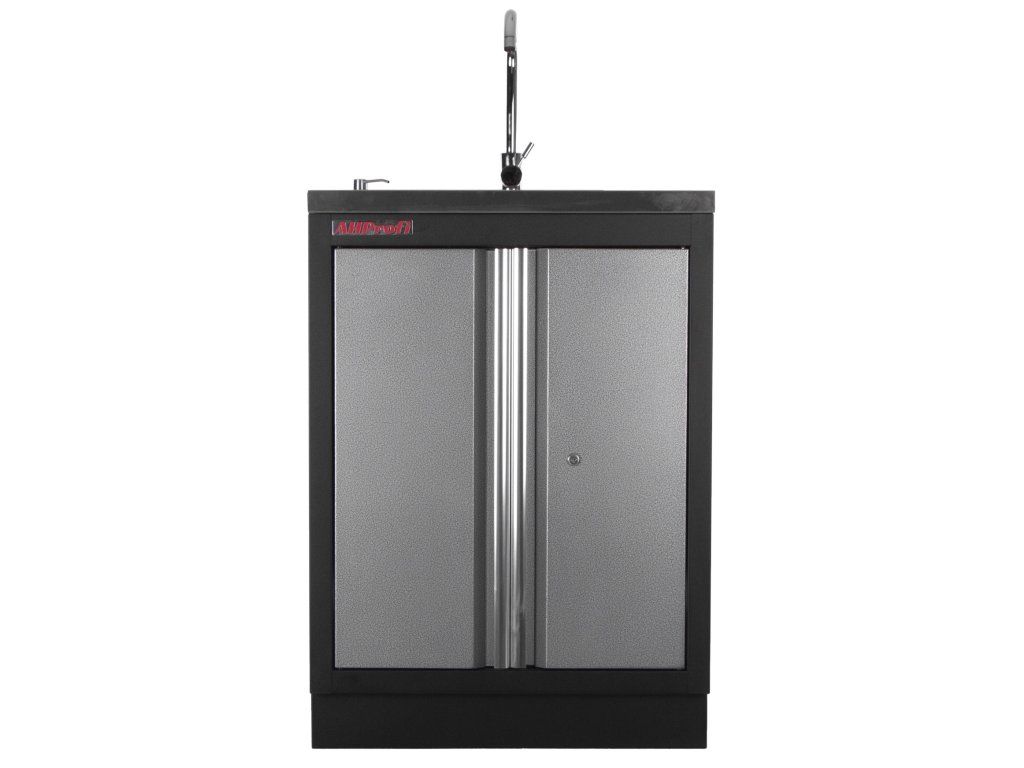 Celokovová PROFI dílenská dvoukřídlá skříňka s vestavěným nerezovým dřezem a baterií.