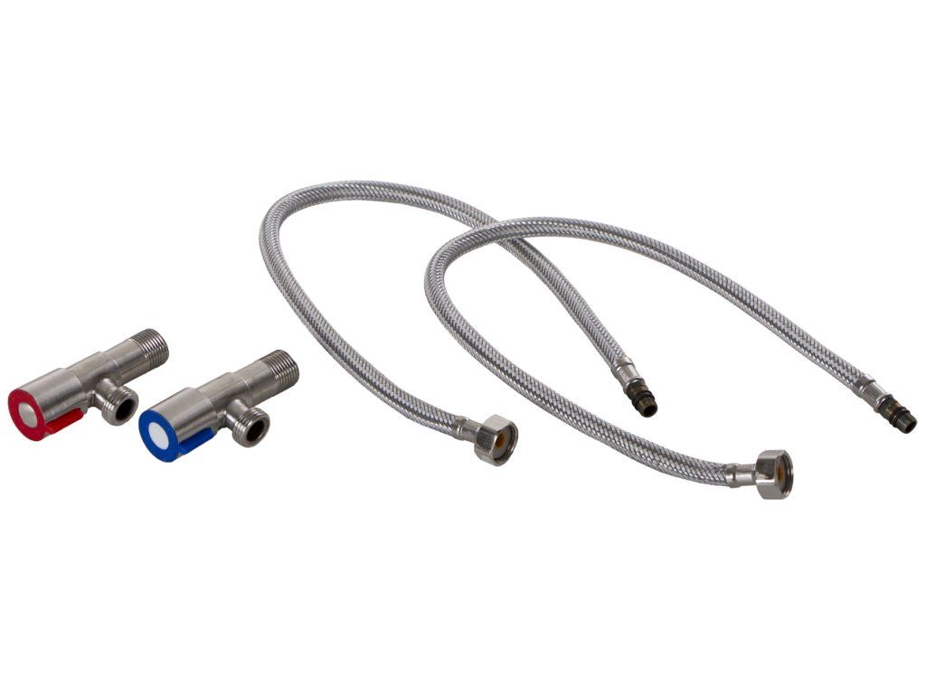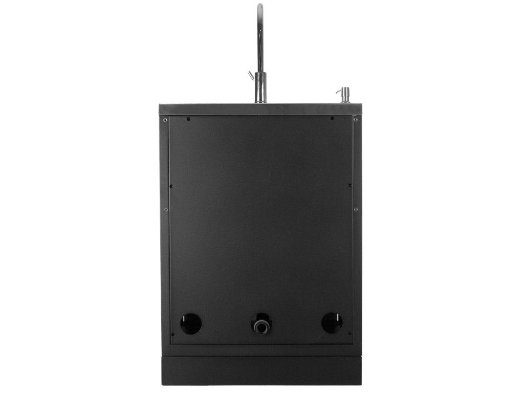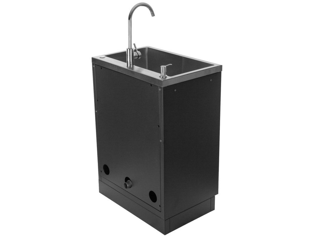 Kompletně vybavená skříňka s baterií, kterou lze umístit do jednoho z rohů nebo doprostřed nerezového dřezu.