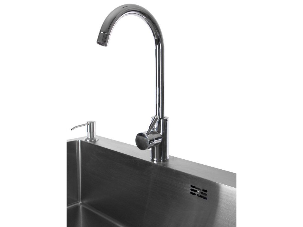 Součástí dřezu je také vestavěný dávkovač na mýdlo, kompletní odpad a příslušenství pro připojení teplé i studené vody.