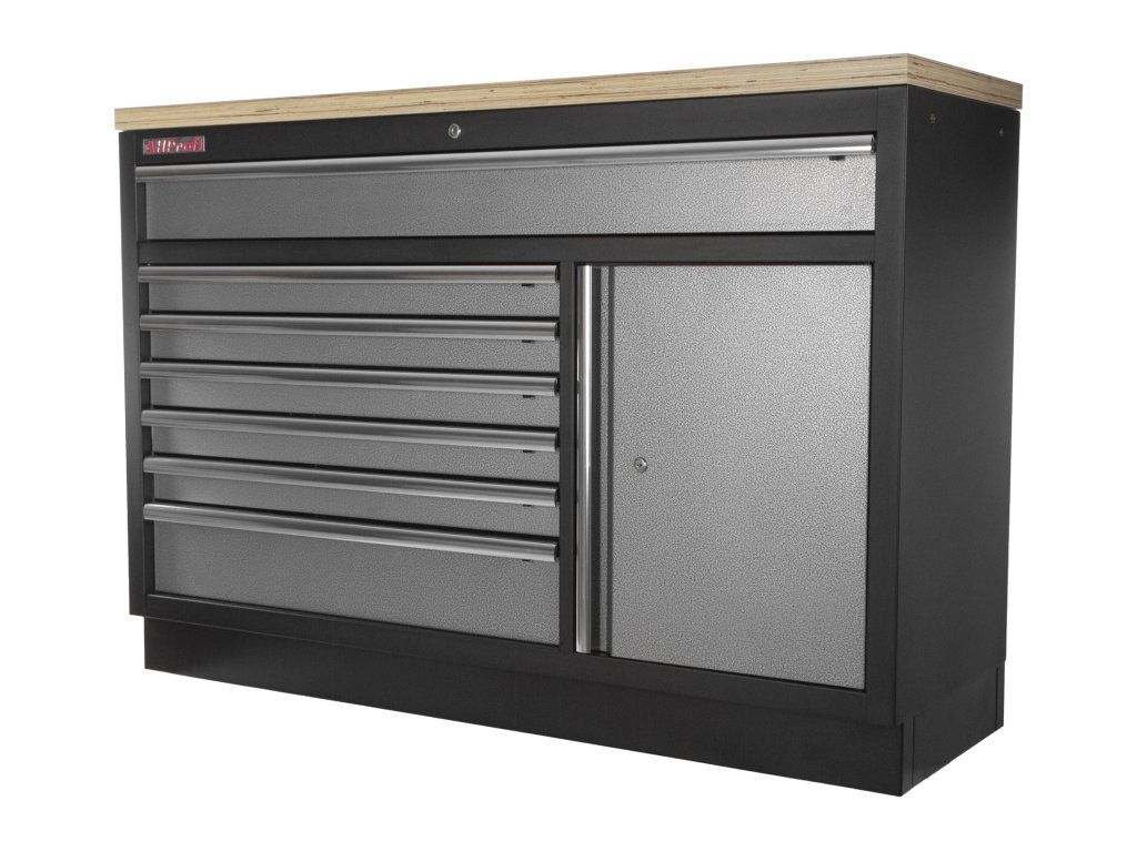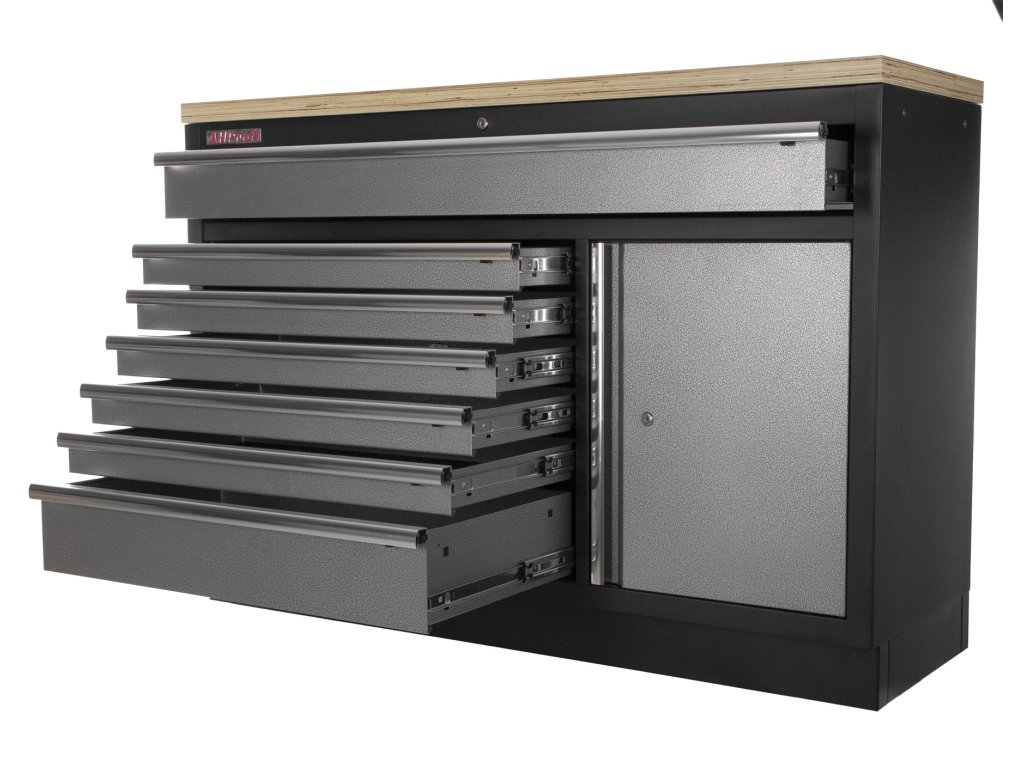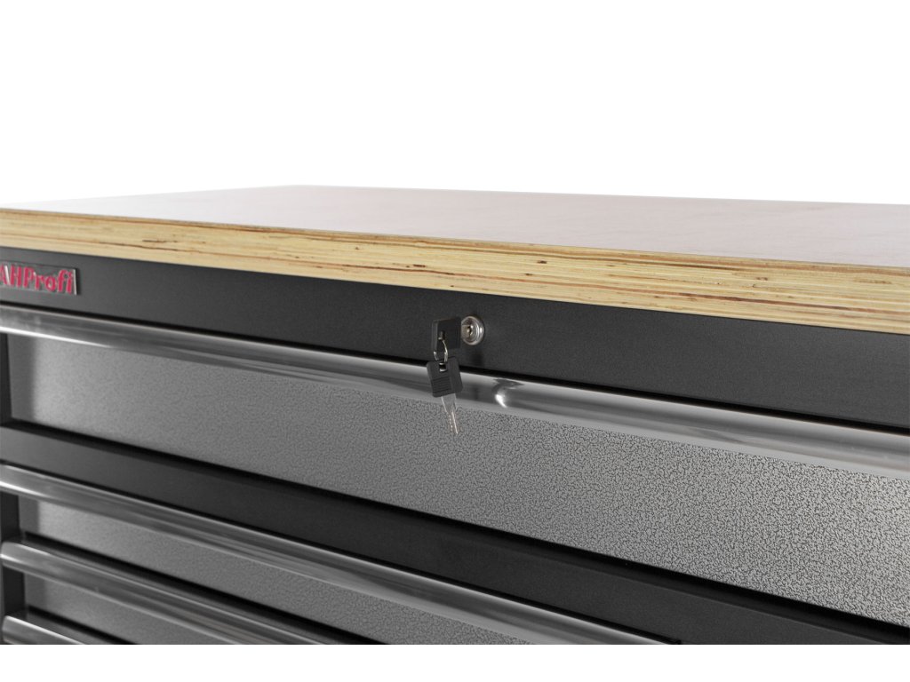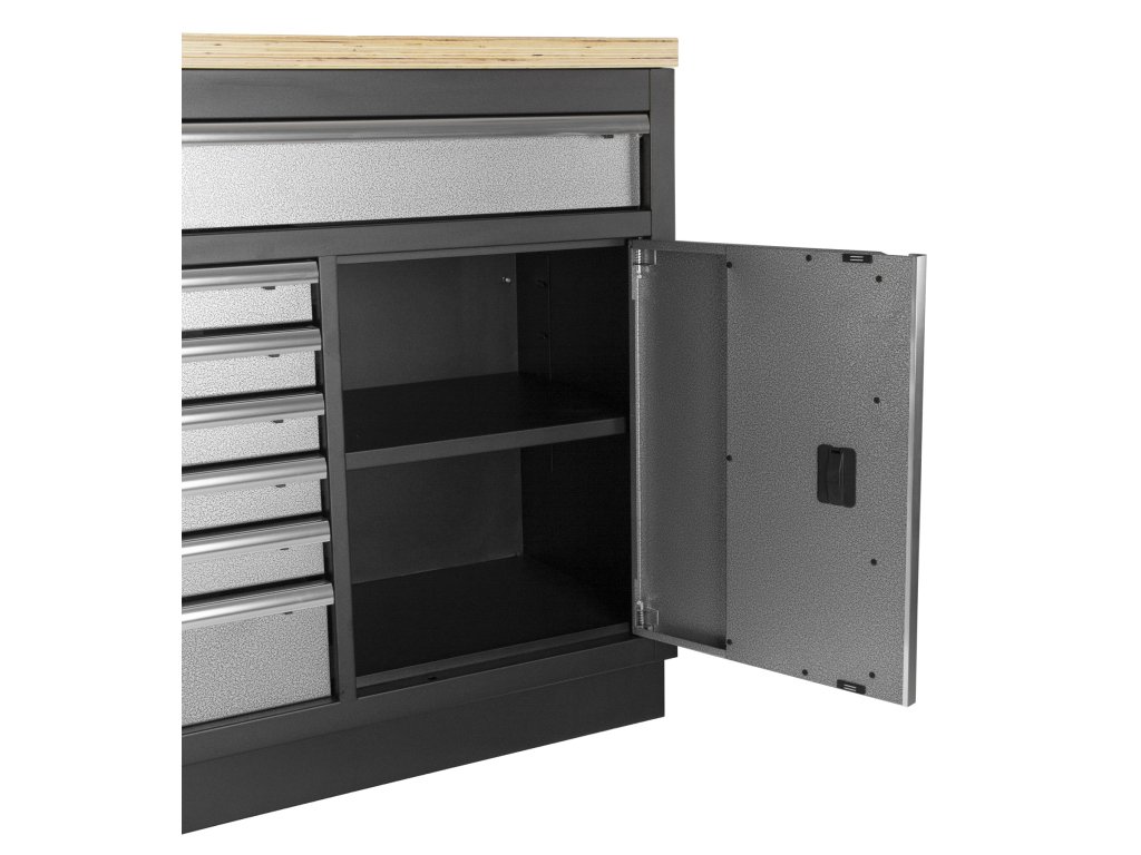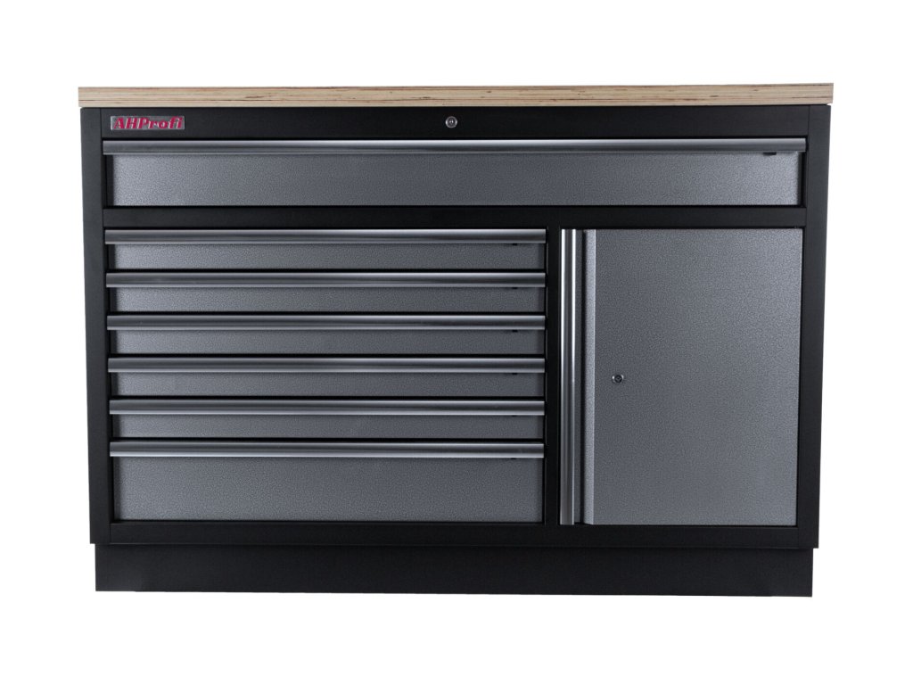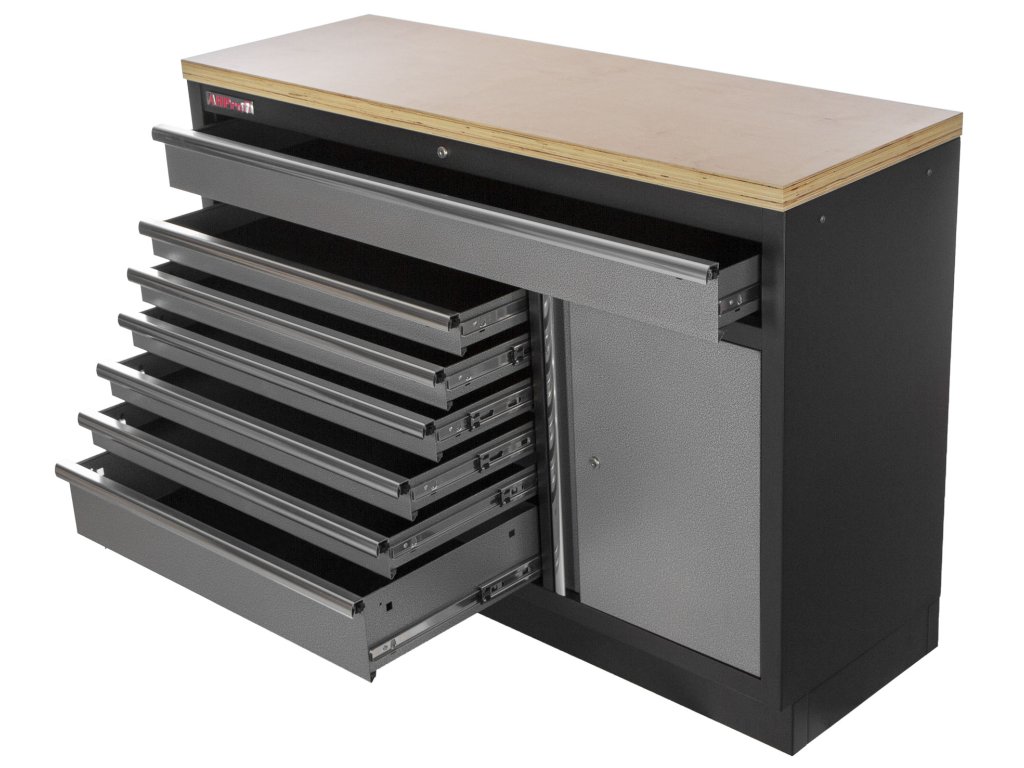 Široká celokovová dílenská skříňka se 7 zásuvkami, skříňkou a dřevěnou pracovní deskou.