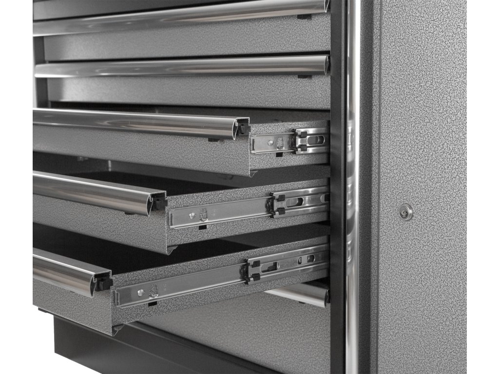 Na levé straně je celkem 6 zásuvek, které se hodí zejména pro ruční nářadí nebo výplně s nářadím, do spodní hlubší zásuvky lze uskladnit i větší nářadí.