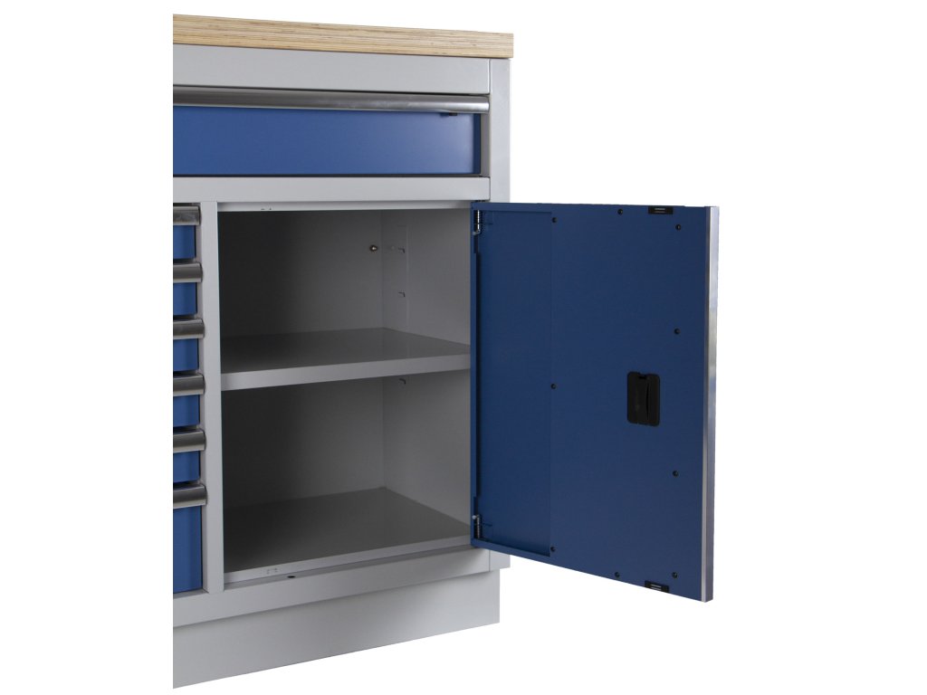 Široká celokovová dílenská skříňka se 7 zásuvkami, skříňkou a dřevěnou pracovní deskou.