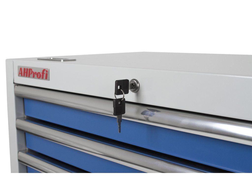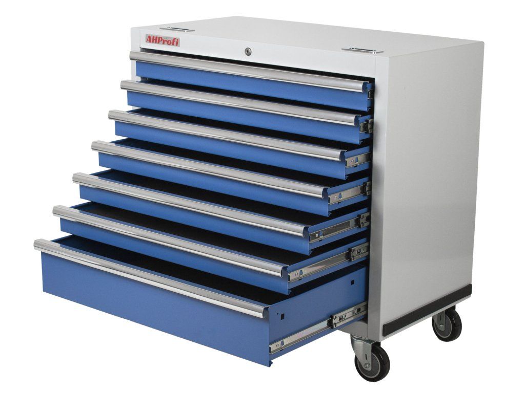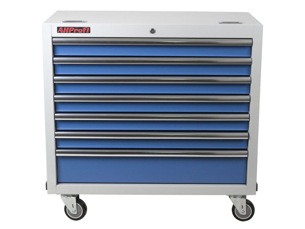 Celokovový dílenský vozík o rozměrech 895 x 458 x 860 mm, 7 uzamykatelných zásuvek.