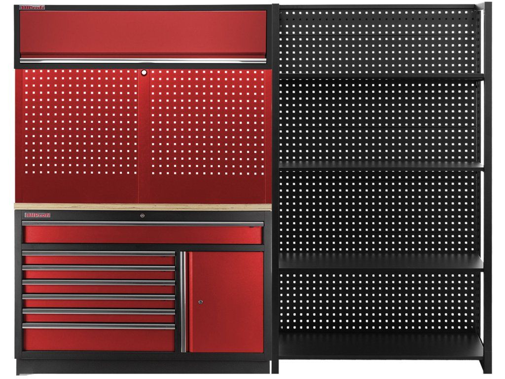 Sestava PROFI RED dílenského nábytku s jedním širokým regálem je vhodnou alternativou do menších prostor.
