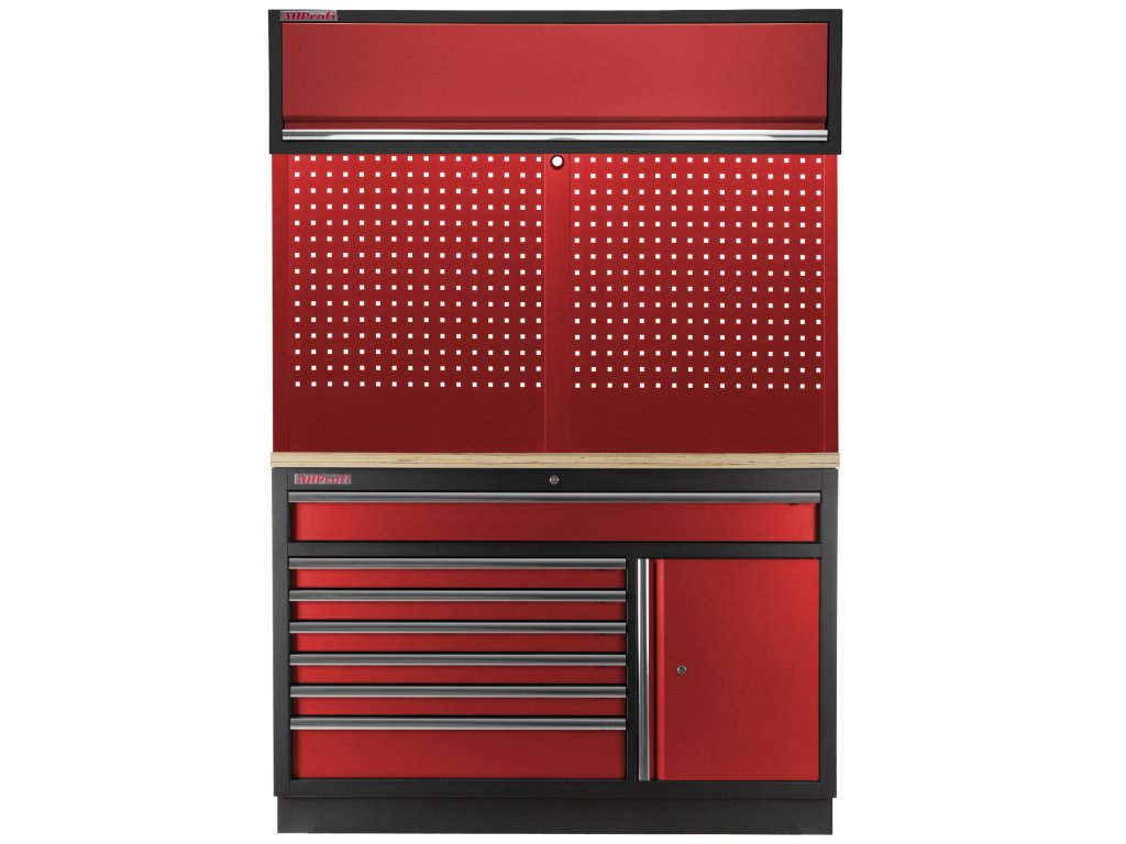 Spodní široká celokovová dílenská skříňka se 7 zásuvkami, skříňkou a dřevěnou pracovní deskou.