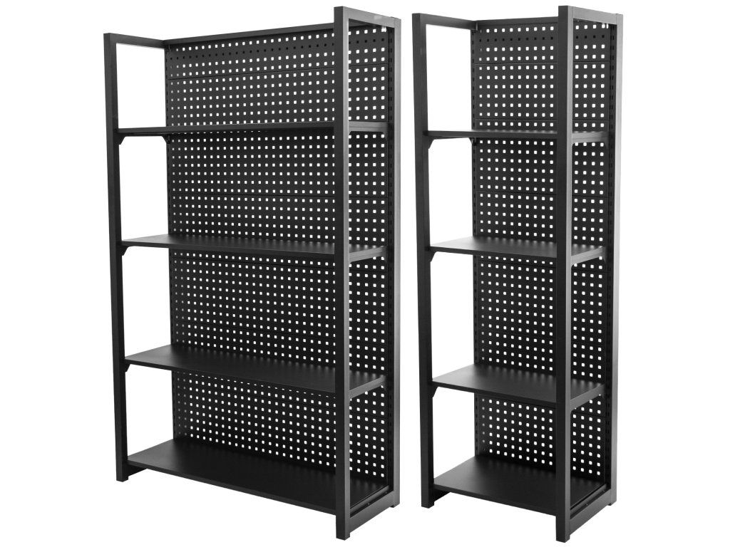 Stabilitu regálů zajišťují bočnice a zadní děrovaná deska, kterou lze také využít pro zavěšení drobného nářadí pomocí háčků (nářadí a háčky nejsou součástí balení).