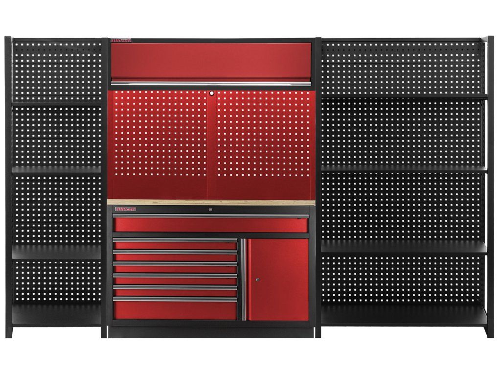 Sestava PROFI RED dílenského nábytku s jedním úzkým a jedním širokým regálem je vhodnou alternativou do menších prostor.