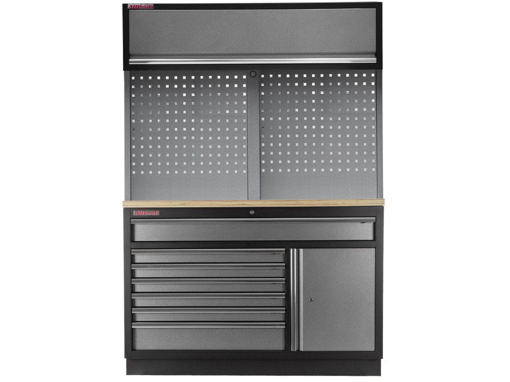 Spodní široká celokovová dílenská skříňka se 7 zásuvkami, skříňkou a dřevěnou pracovní deskou.