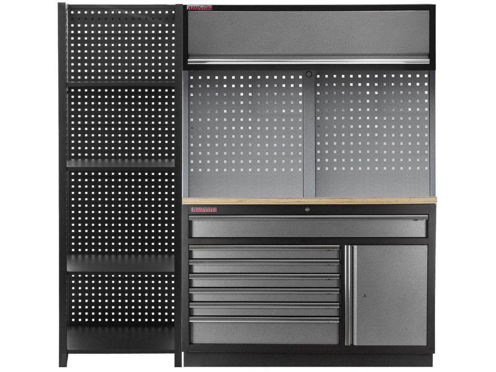 Sestava PROFI dílenského nábytku s jedním úzkým regálem je vhodnou alternativou do menších prostor.
