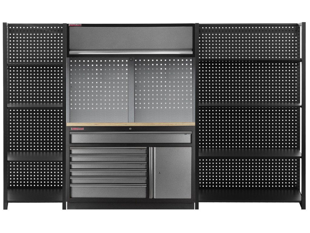 Stabilitu regálů zajišťují bočnice a zadní děrovaná deska, kterou lze také využít pro zavěšení drobného nářadí pomocí háčků (nářadí a háčky nejsou součástí balení).