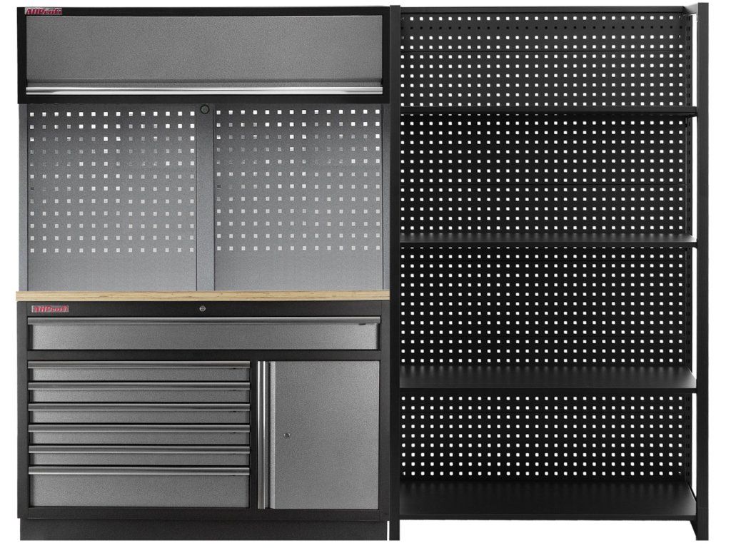 Sestava PROFI dílenského nábytku s jedním širokým regálem je vhodnou alternativou do menších prostor.