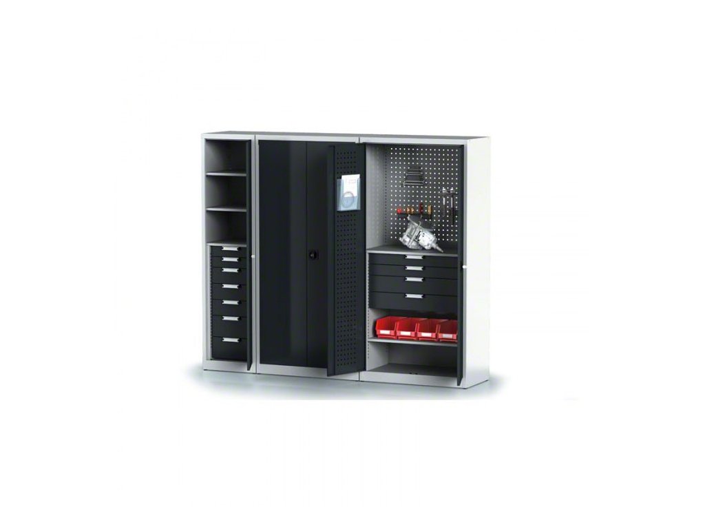 Korpus dílenské/kancelářské skříně je svařen z ocelového plechu, který dává dostatečnou tuhost celé skříni, která tak má nosnost až 600 kg. Vnitřní strana dveří je opatřena děrovanou závěsnou deskou EUROPERFO perforací pro instalaci držáků ručního nářadí a dílenského vybavení. Dle varianty je závěsný systém EUROPERFO instalován do horní části zadní stěny dílenské skříně. Dveře jsou uloženy v masívních čepech s úhlem otevření 110 stupňů s výztuhou. Tříbodový cylindrický zámek s otočnou rukojetí se dvěma klíči dodává velkou bezpečnost před nezvaným otevřením. Police s nosností 80 kg jsou přestavitelné po 25 mm. Zásuvky mají plošnou nosnost 40 kg se 100% výsuvem. Do zásuvek je možné instalovat děliče v příčném směru.