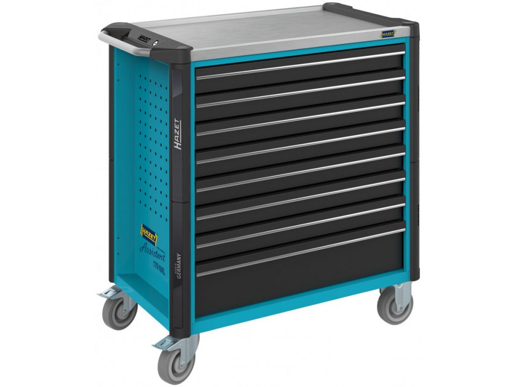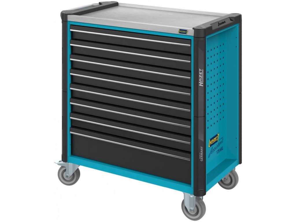 Dílenský vozík s robustní konstrukcí z ocelového plechu s osmi zásuvkami, které jsou osazeny vodícími lištami s kuličkovými ložisky.