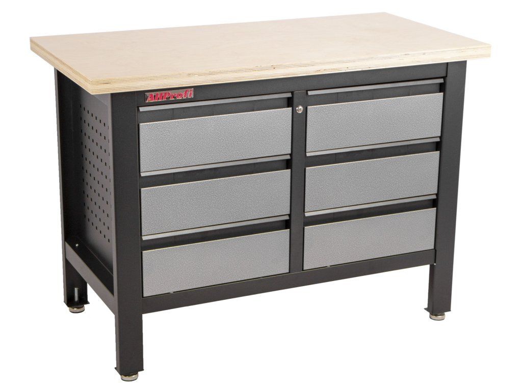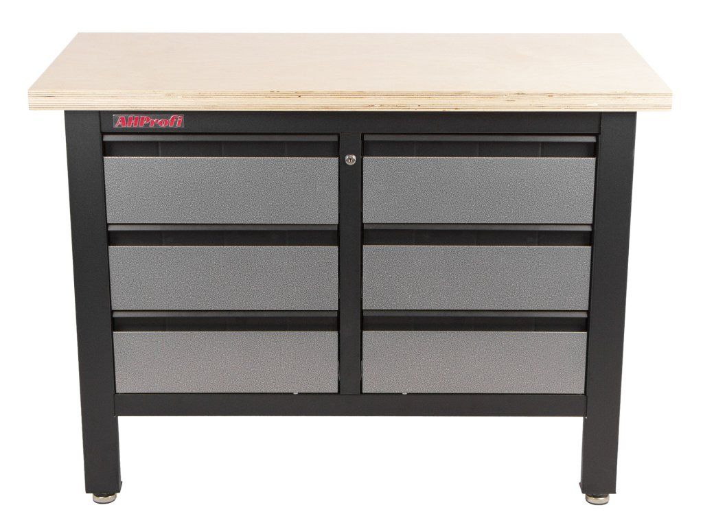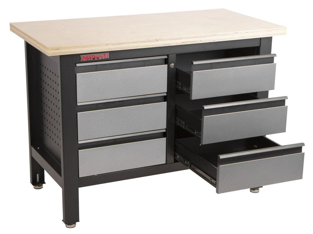 Stůl je vybavený dřevěnou pracovní deskou o rozměrech 1200 x 600 mm a obsahuje 6 uzamykatelných zásuvek.