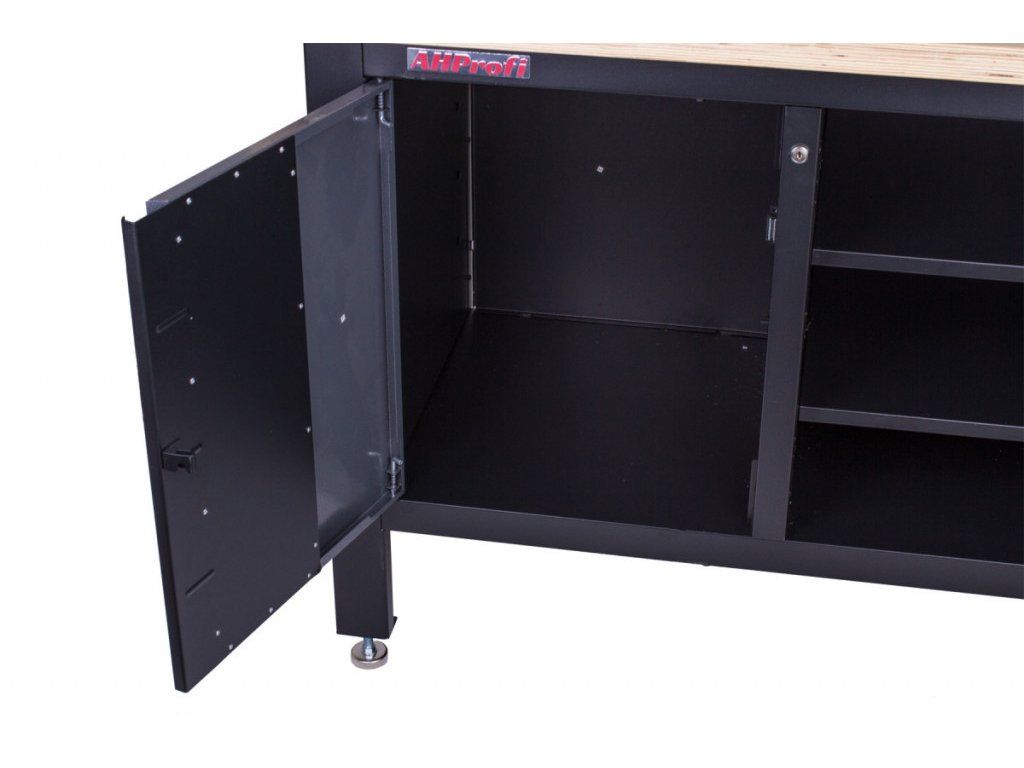 Uzamykatelná skříňka a zásuvky chrání nářadí před prachem i neoprávněným přístupem, otevřené regály poskytují rychlý přehled o obsahu. Po stranách jsou děrované desky pro zavěšení často používaného nářadí.