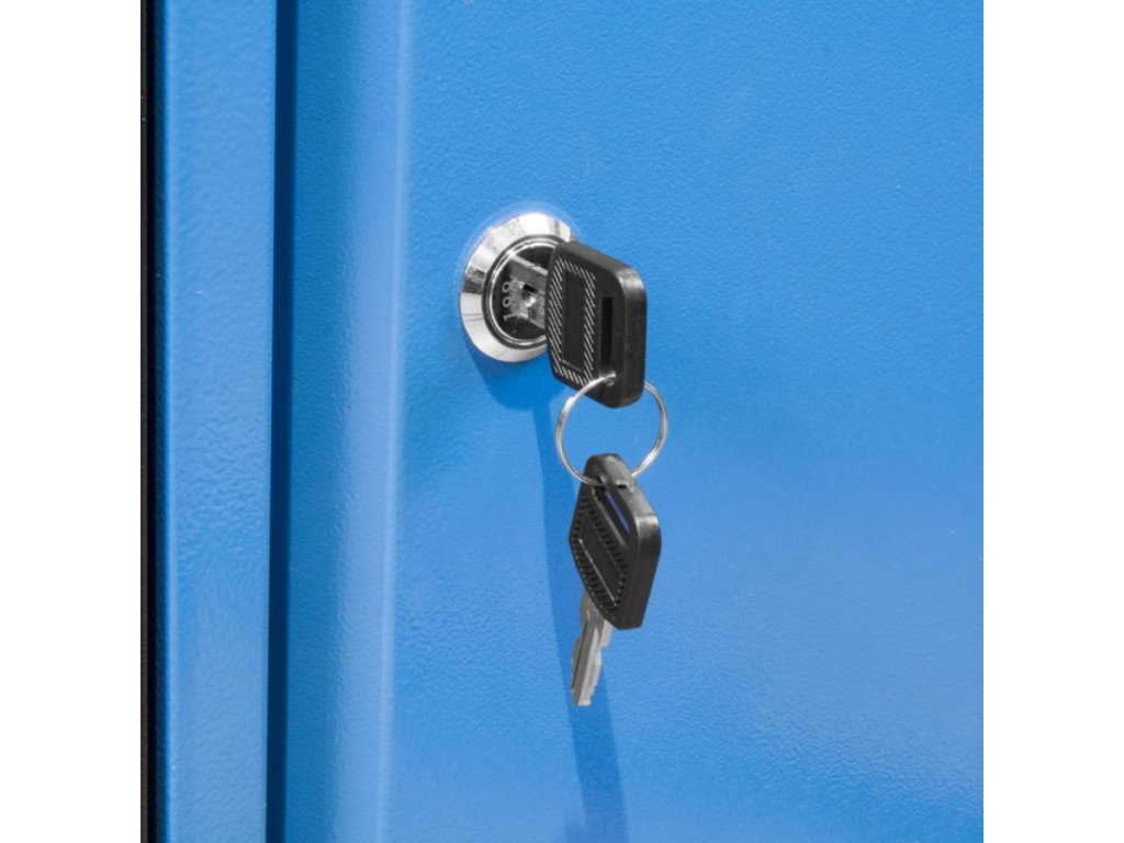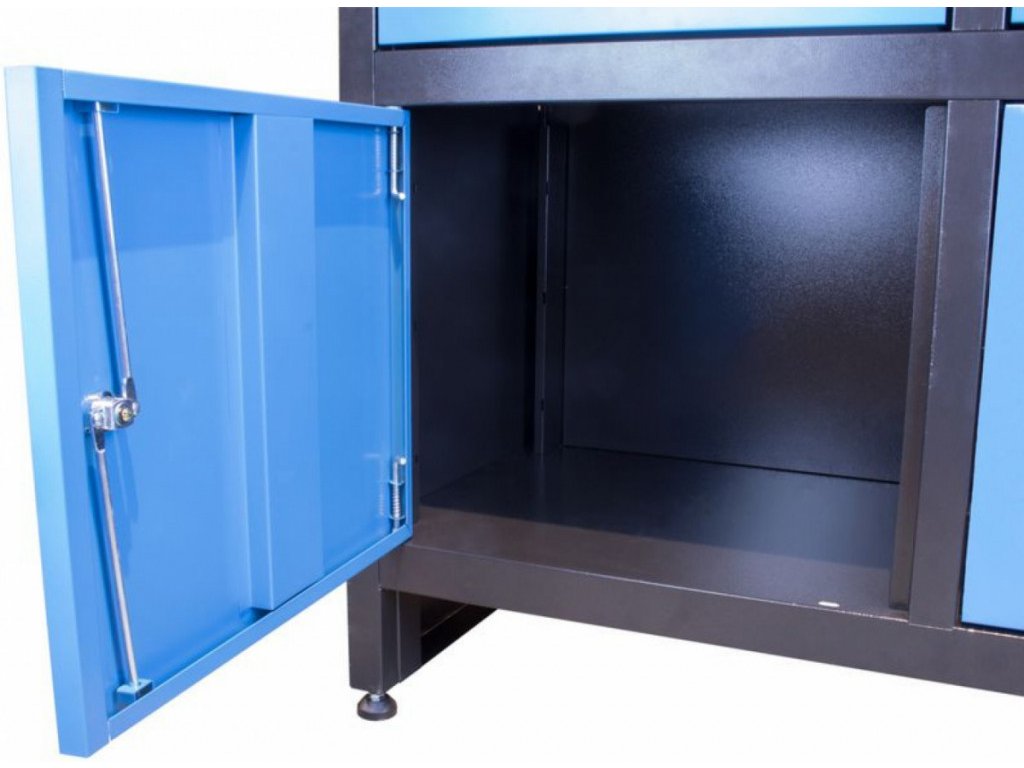 Ponk do dílny je vybaven 6 prostornými zásuvkami (440 x 400 x 95 mm) s teleskopickými výsuvnými lištami, které zvládnou nosnost až 25 kg. Díky plnému výsuvu máte snadný přístup k veškerému nářadí a materiálu. Dvě uzamykatelné skříňky (465 x 400 x 390 mm) s cylindrickými zámky ochrání vaše cenné nástroje.