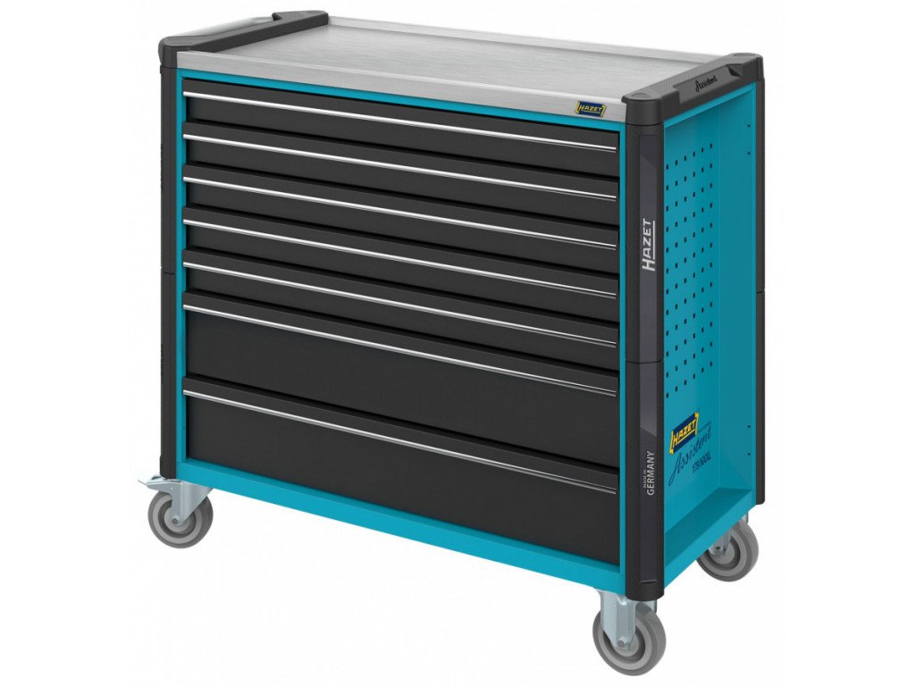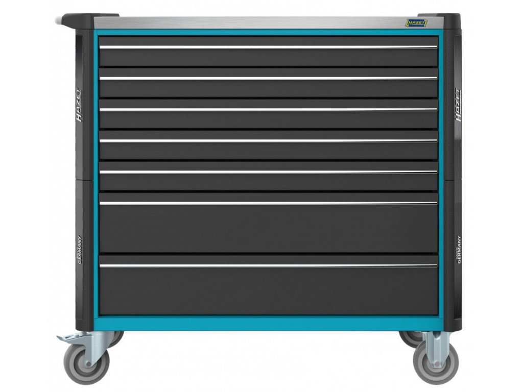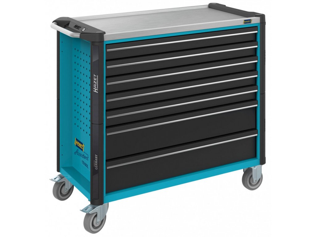 Dílenský vozík s robustní konstrukcí z ocelového plechu se sedmi zásuvkami, které jsou osazeny vodícími lištami s kuličkovými ložisky.
