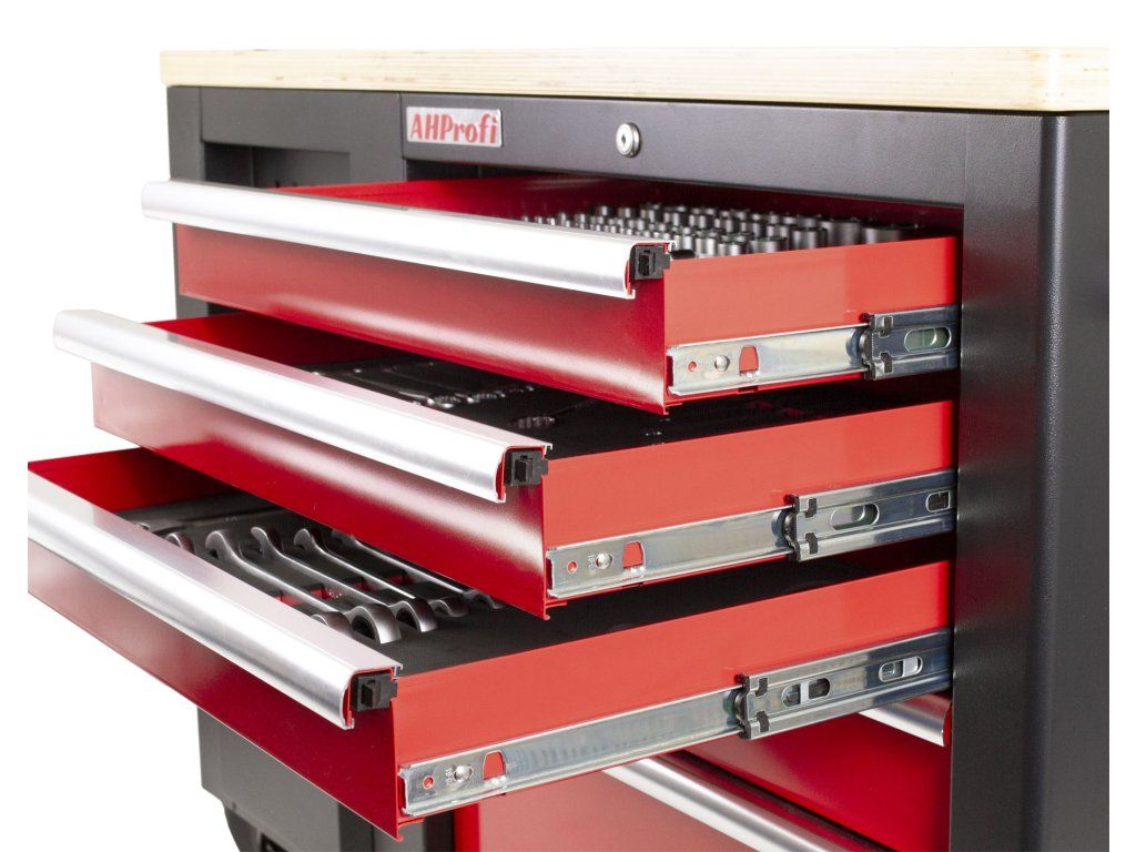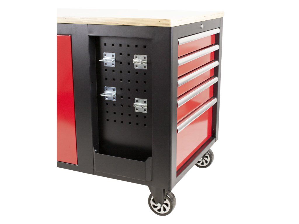 Na širších stranách vozíků jsou 2x děrované desky s přihrádkou, z jedné strany 5 zásuvek a z druhé dvoukřídlá skříňka se 2-mi poličkami. Na užších stranách se nachází dalších 5 zásuvek a madlo pro snadné manipulování s dílenských vozíkem.
