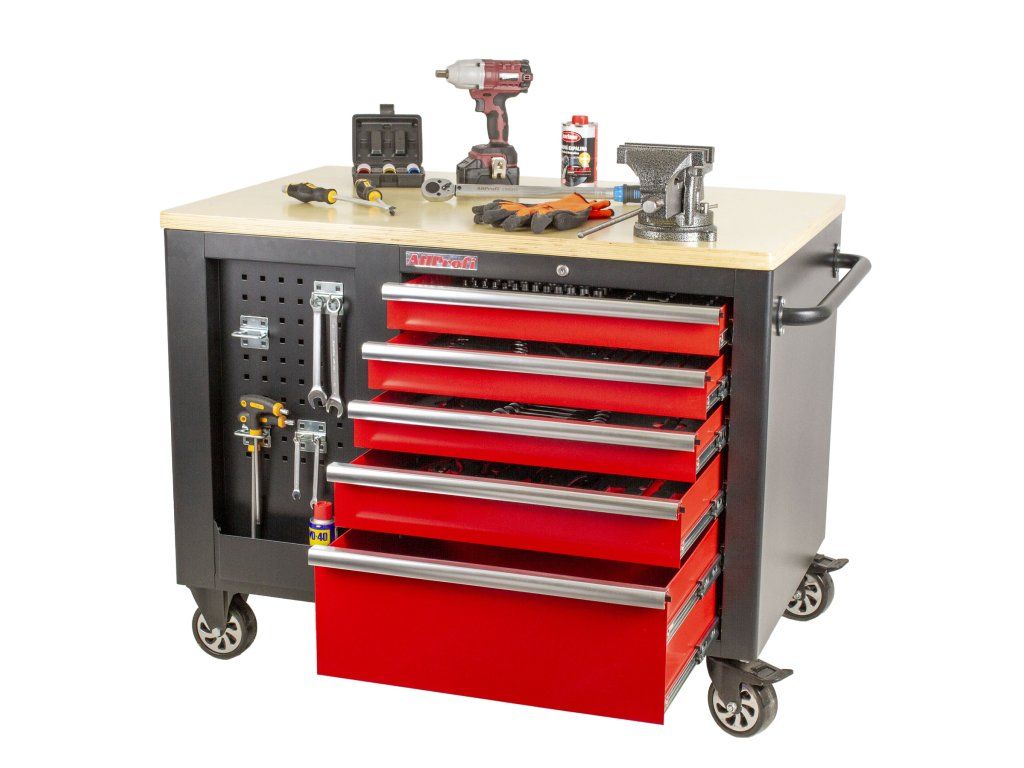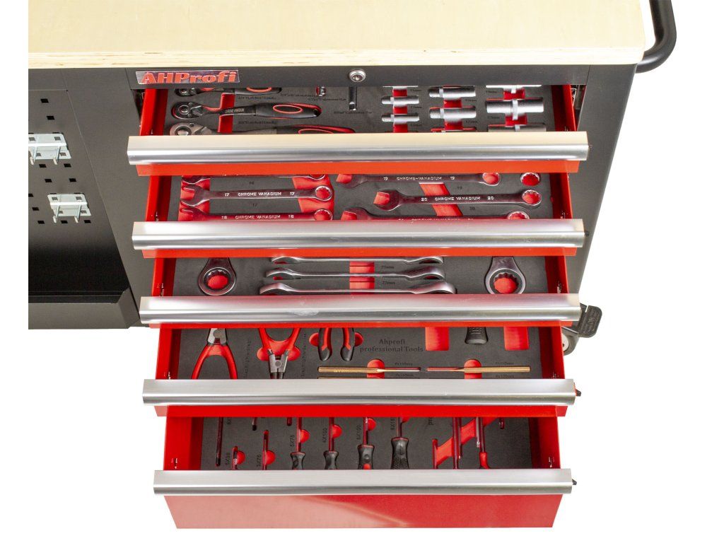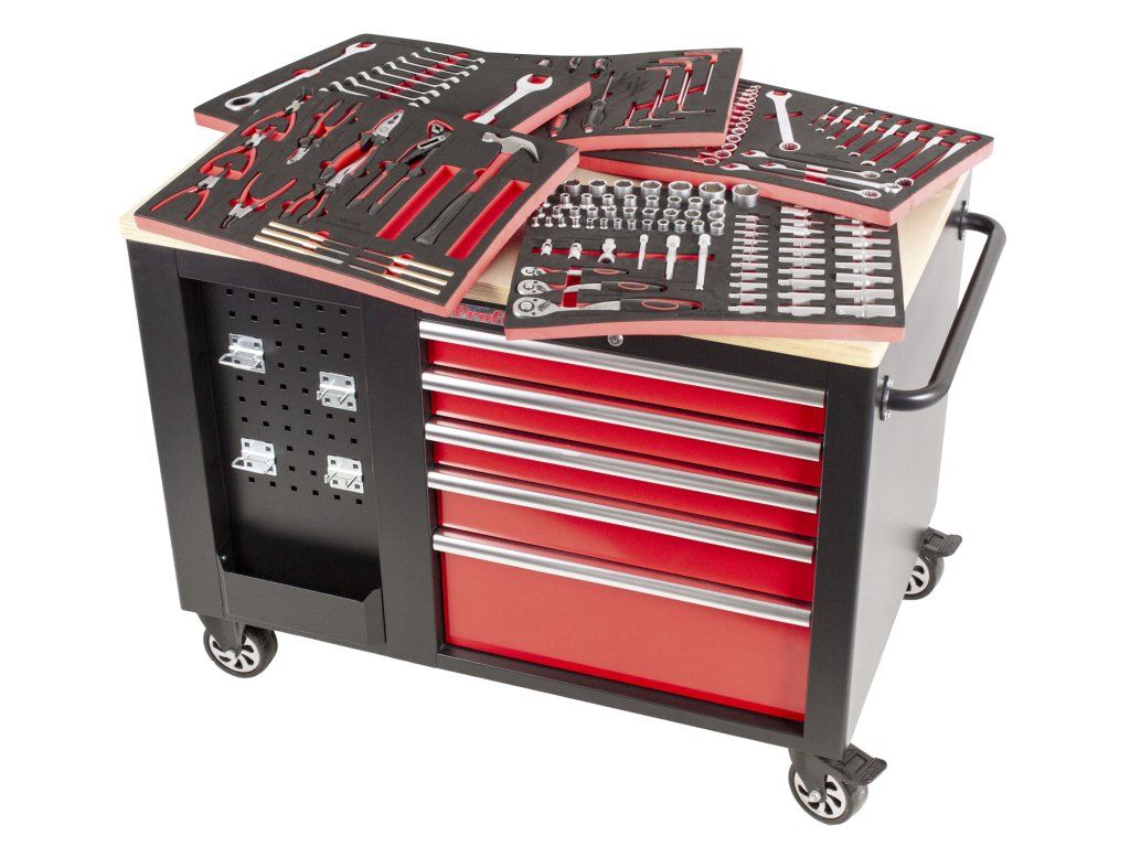 Velký vybavený dílenský vozík využitelný ze všech stran. 10 zásuvek. 2x děrované desky s přihrádkou. Madlo a kolečka pro snadnou manipulaci. 138 ks nářadí v pěnových výplních.