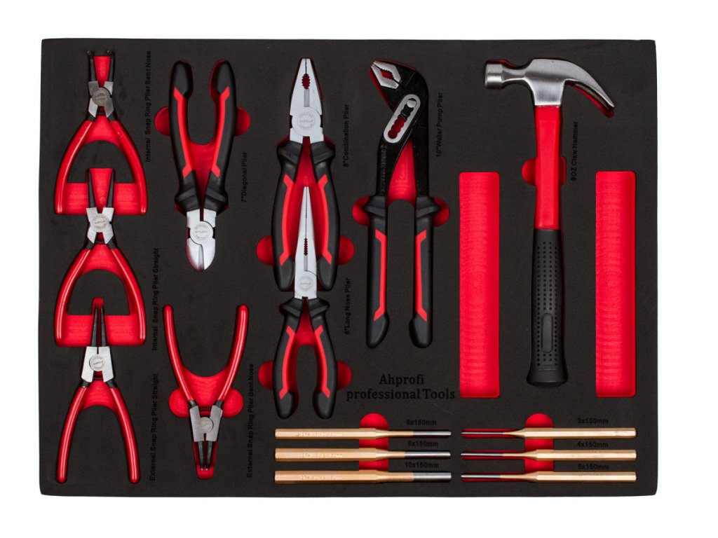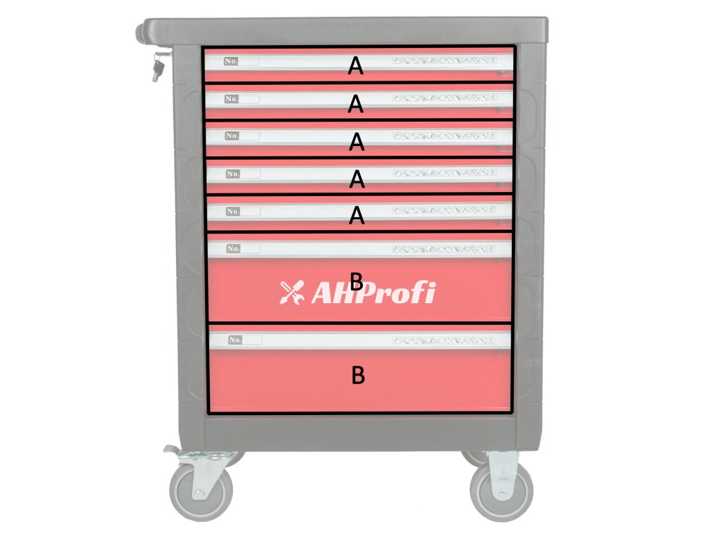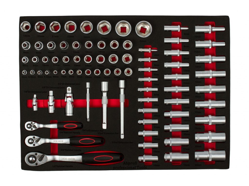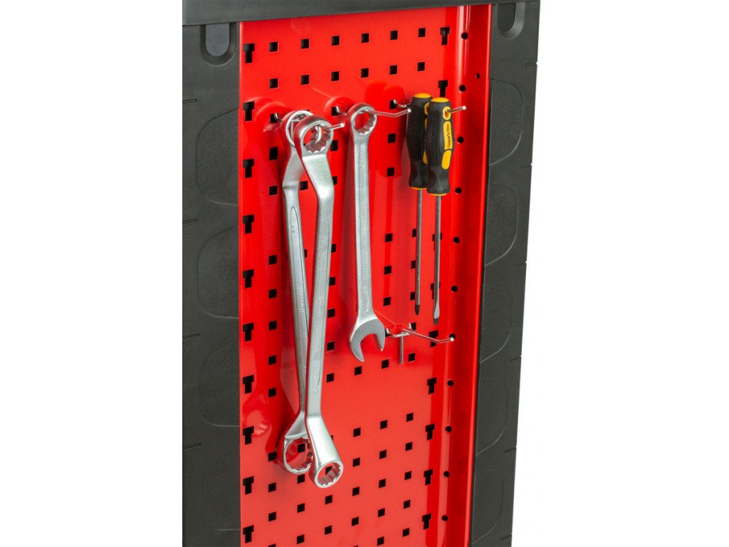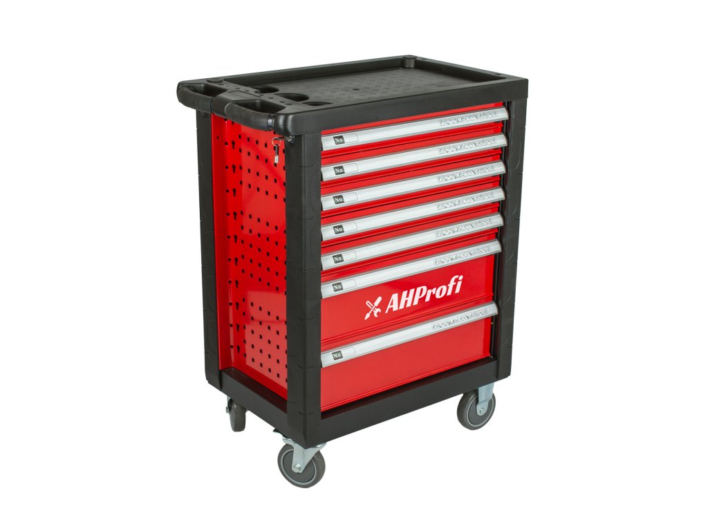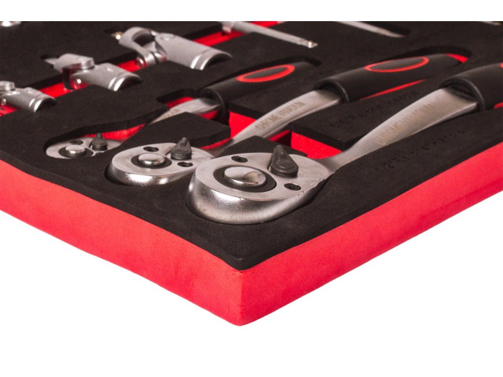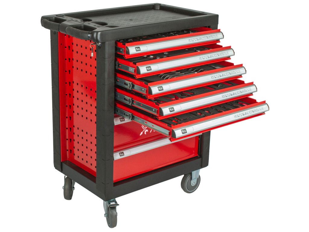 Červený dílenský vozík se 7-mi zásuvkami obsahuje 138 kusů nejpoužívanějšího nářadí. Nářadí se nachází v 5 pěnových výplní. Pěnovou výplň můžete klidně pověsit na zeď a stále v ní nářadí drží, na rozdíl od plastových výplní.