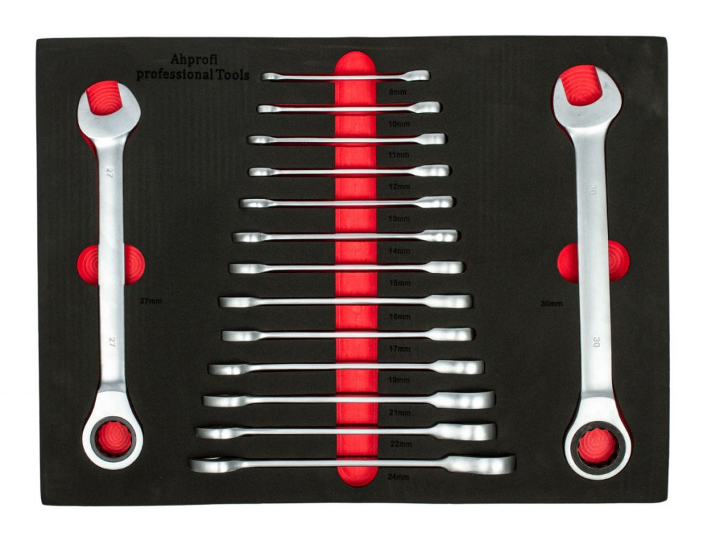 | 15 ks | Ráčnové očkoploché klíče: 8, 10, 11, 12, 13, 14, 15, 16, 17, 19, 21, 22, 24, 27 a 30 mm. |