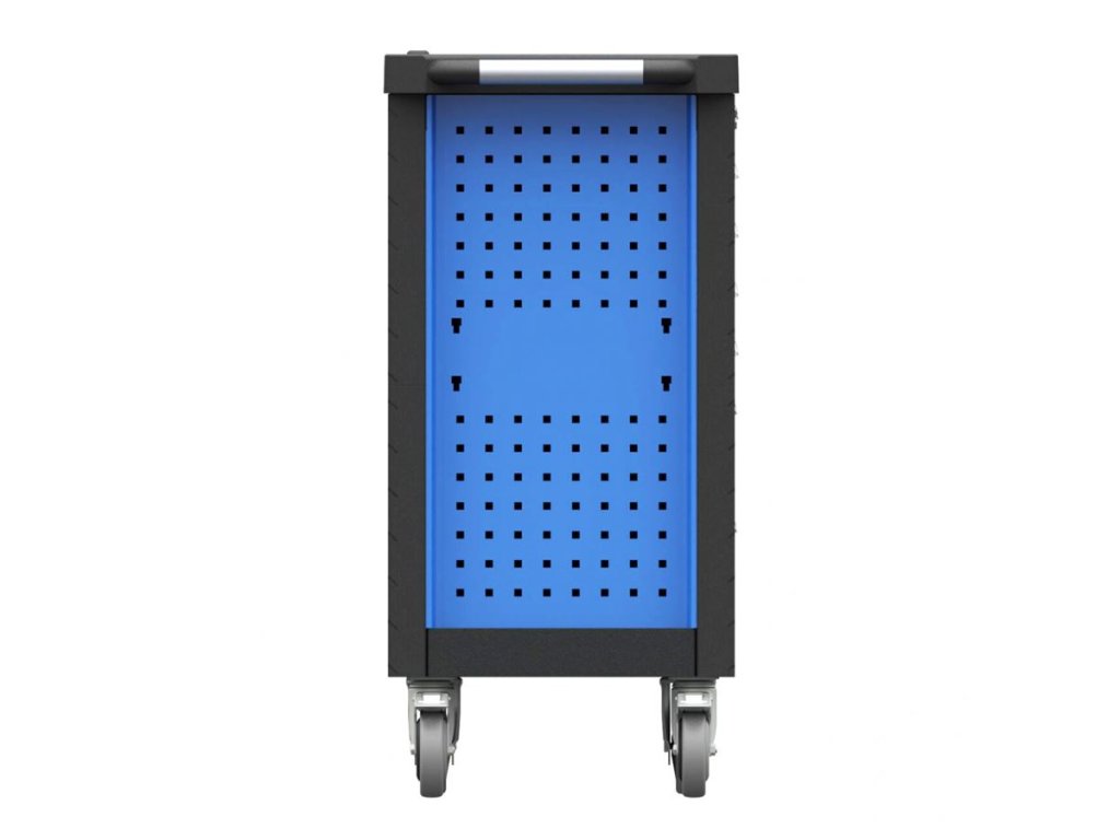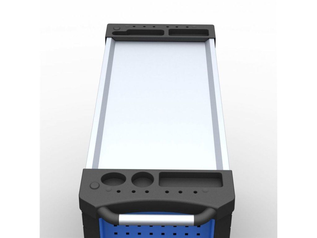 Vozík na nářadí je zkonstruován z zdvojeného ocelového plechu s kovovými částmi, které jsou chráněny práškovým lakem. Barevné provedení je atraktivní kombinace RAL 9005 (rám) a RAL 5015 (stěny a zásuvky).