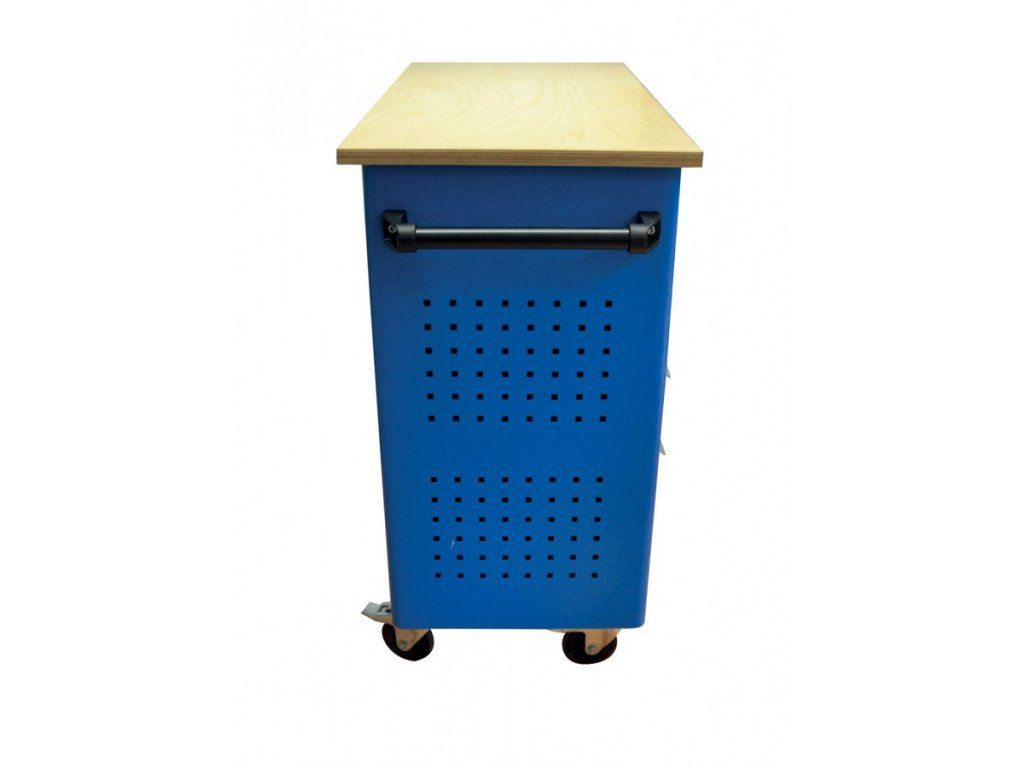 Vybavení: 5 zásuvek (→ 2 x výška 55 mm/2 x výška 125 mm/1 x výška 270 mm, centrální uzamykání cylindrickým zámkem, 2 klíče); děrované stěny pro upevnění závěsných držáků nářadí (→ otvory 10 mm2); boční odkládací plocha s poličkou